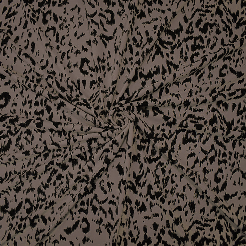 -Poly stretch spandex ITY knit fabric printed with an abstract leopard-like inspired pattern