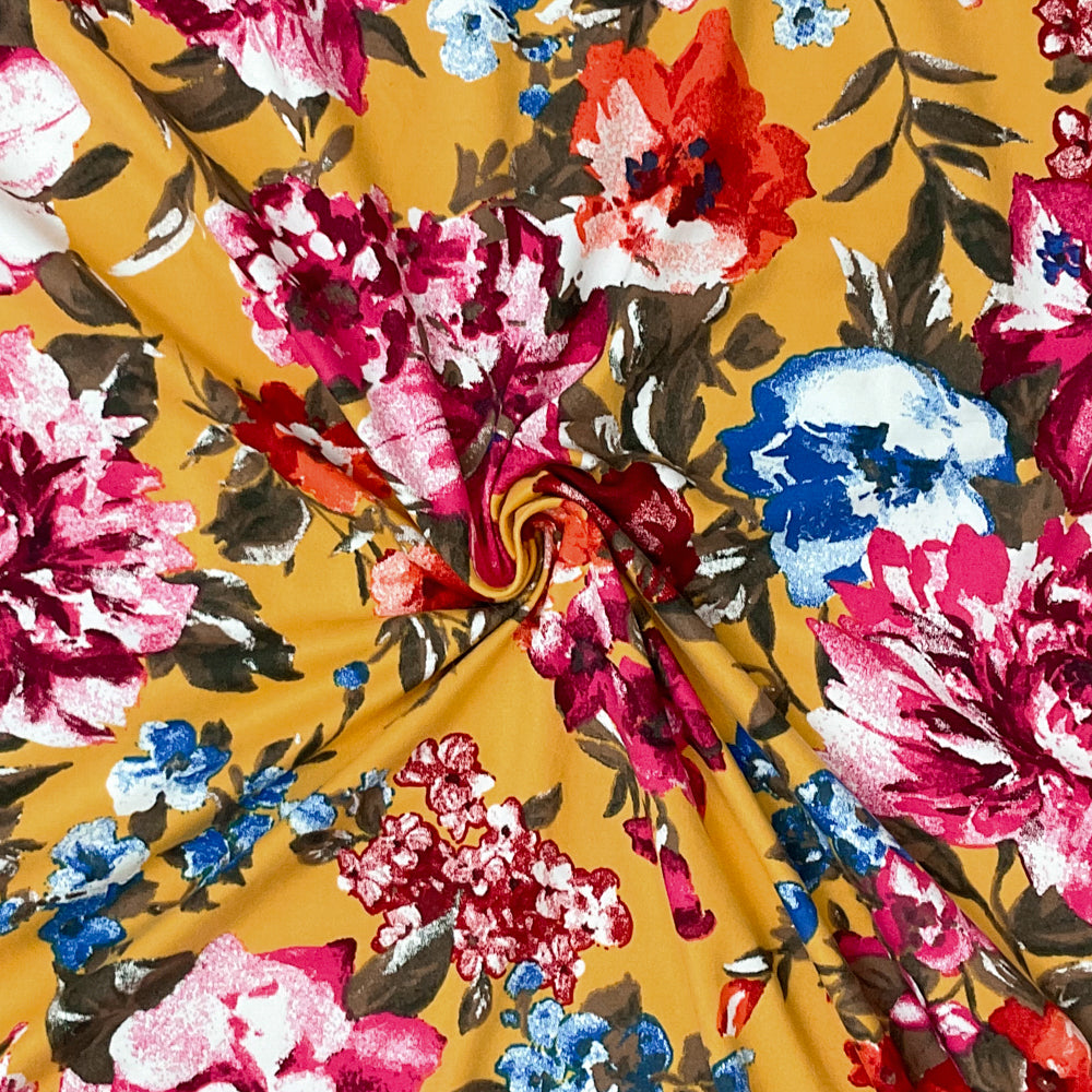 -Yellow-Multi Poly Spandex Stretch Floral Print Double Brush Jersey Knit Fabric