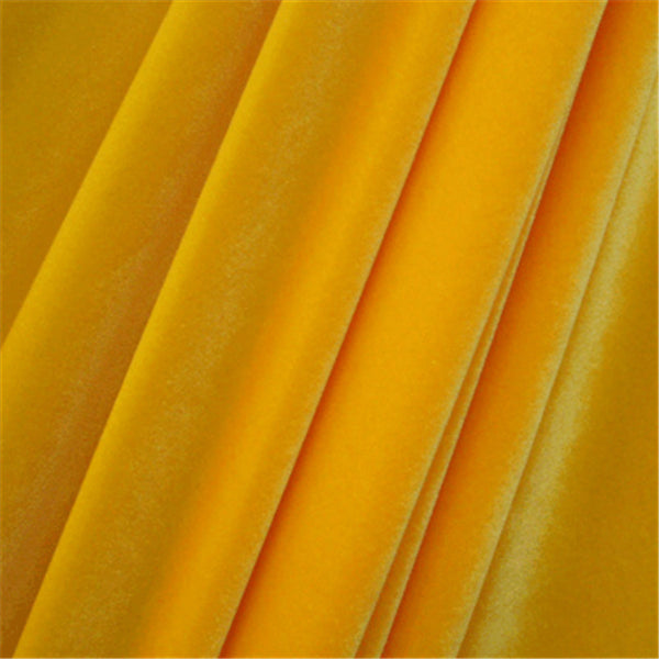 Solid Yellow Stretch Velvet Fabric A perfect combination of 90% Polyester/10% Spandex mades for a terrific fitting fabric. With great 4-way stretch and recovery, you can design your dancewear, costume, dresses, and other garment with confidence that they will look great.420 Grams/yd. 58"-60" Wide