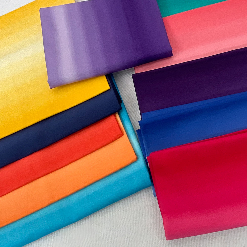 - Bundle fabrics include: 5/8 yard ombre purple, 5/8 yard navy light blue ombre, 5/8 yard deep orange ombre, 5/8 yard pumpkin orange ombre, 5/8 yard yellow ombre, 7/8 yard green ombre, 7/8 yard coral ombre, 1 yard violet ombre, 1 1/8 yard royal blue, 1 1/8 yard hot pink, 1 5/8 yard bright sky blue. Pattern is not included.