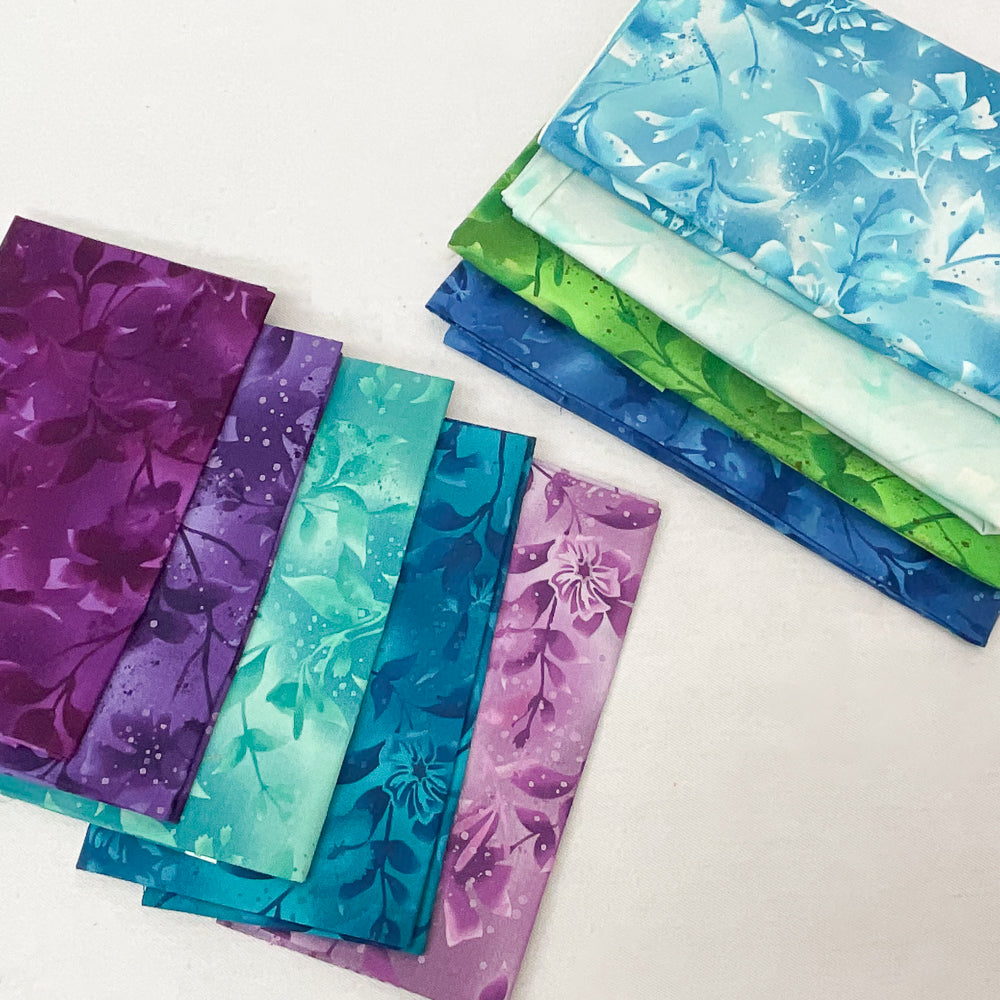 - Bundle fabrics include: 3/4 yard royal blue tonal, 1/4 yard red purple tonal, 1/4 yard purple tonal, 1/4 yard lilac tonal, 1/4 yd dark turquoise tonal, 1/4 yard green blue tonal, 5/8 yard yellow green tonal, 1 yard green tonal, 1 1/4 yard aqua tonal, 1 3/8 yard sky blue tonal. Pattern is not included.