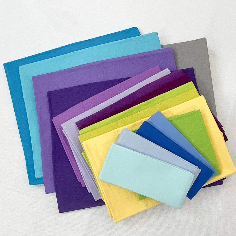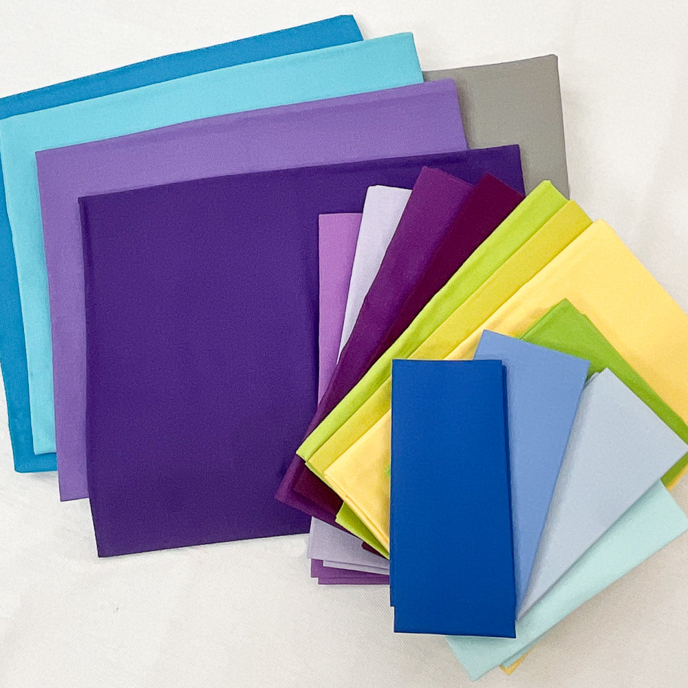 - Bundle fabrics include: 5/8 yd purple solid, 5/8 yd light purple solid, 1/8 yd light blue solid, 1/8 yd dusty blue solid, 1/8 yd water blue solid, 1/8 yd cobalt blue solid, 3/8 yd lime green solid, 3/8 yd light lime green solid, 3/8 yd chartreuse green solid, 3/8 yd purple solid, 3/8 yd light purple solid, 3/8 yd dark purple solid, 1/2 yd light purple solid, 3/8 yd deep purple solid, 3/8 yd yellow solid, 7/8 yd aqua teal solid, 3/4 yd jewel teal solid, 2 3/8 yd gray solid. Pattern is not included