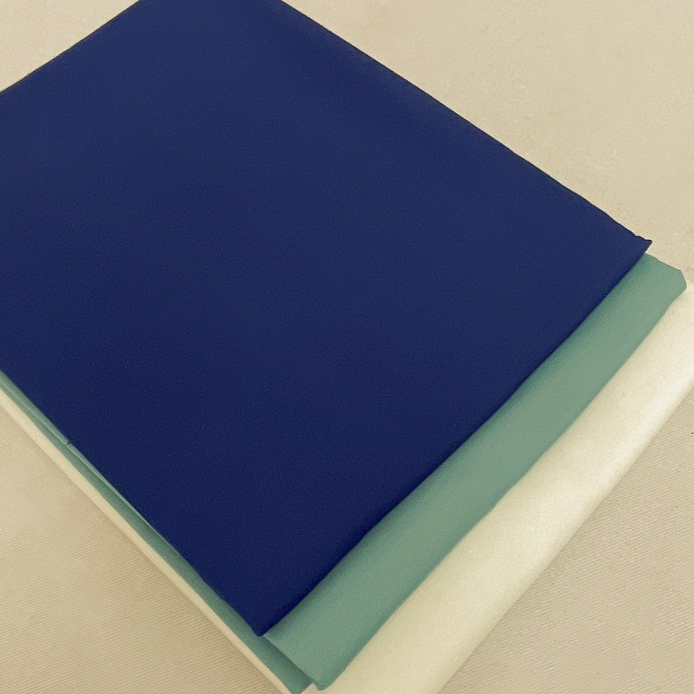 - Bundle fabrics include: 1 3/4 yards royal blue solid, 2 yards soft teal solid, 3 yards white solid. Pattern is not included.