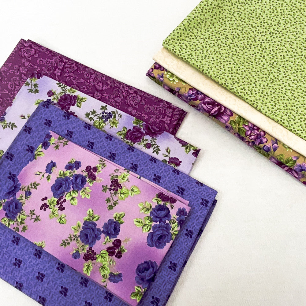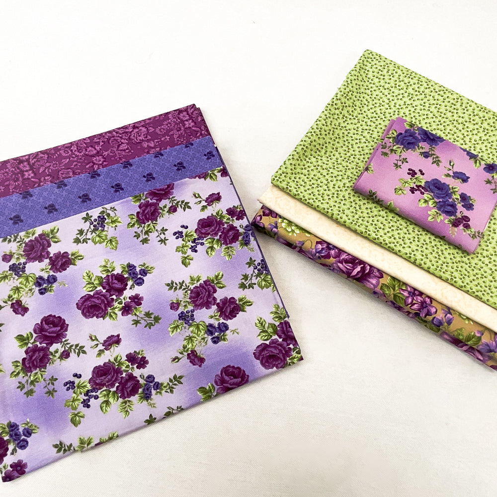 - Bundle fabrics include: 3/4 yard violet green floral, 1/4 yard warm violet floral, 1 yard warm purple floral, 1 yard cool purple tonal rose, 1 1/4 yard green tonal mini abstract leaf, 1 1/4 yard tonal beige floral, 2 1/4 yard purple green floral. Pattern is not included