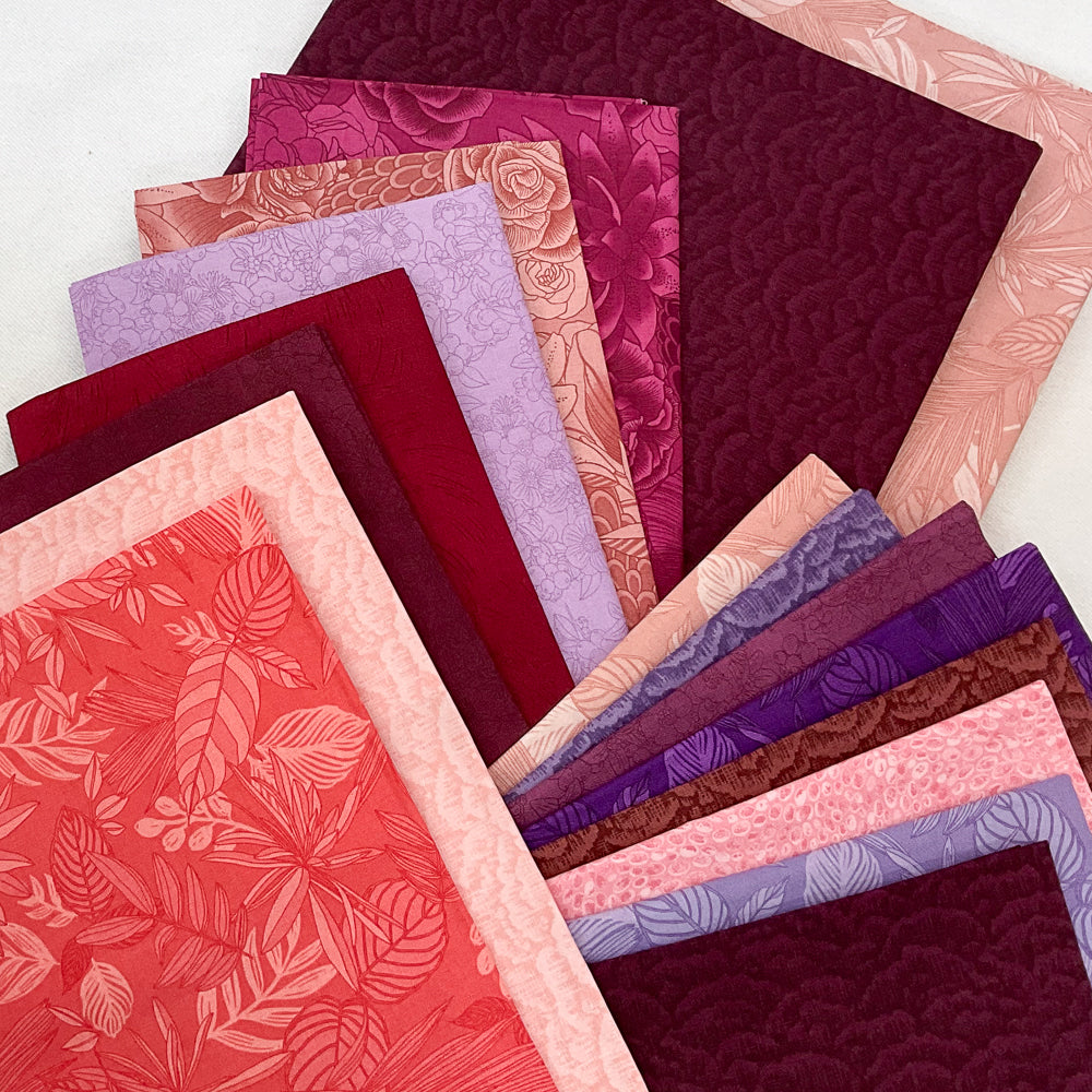 - Bundle fabrics include: 1 yd dusty pink leaf, 1 yd deep purple cloud, 1 fat quarter each, of the following: dark burgundy cloud, light pink cloud, brown cloud, pink pebble, purple leaf, dusty pink leaf, purple cloud, red scribble, purple leaf, wine purple floral, light purple floral, pink red floral, burgundy floral, burgundy tonal floral, coral red floral. Pattern is not included. Pictured is one possible version that could be made with this bundle.