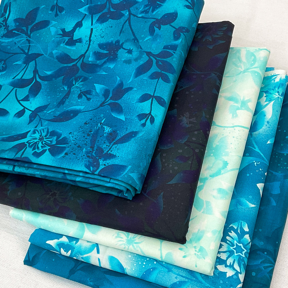 - Bundle fabrics include: 1 1/4 yds teal tonal floral, 1 1/4 yds aqua teal tonal floral, 1 3/4 yds aqua ivory tonal floral, 1 3/4 yds navy green tonal floral, 3 5/8 yds teal blue tonal floral. Pattern is not included
