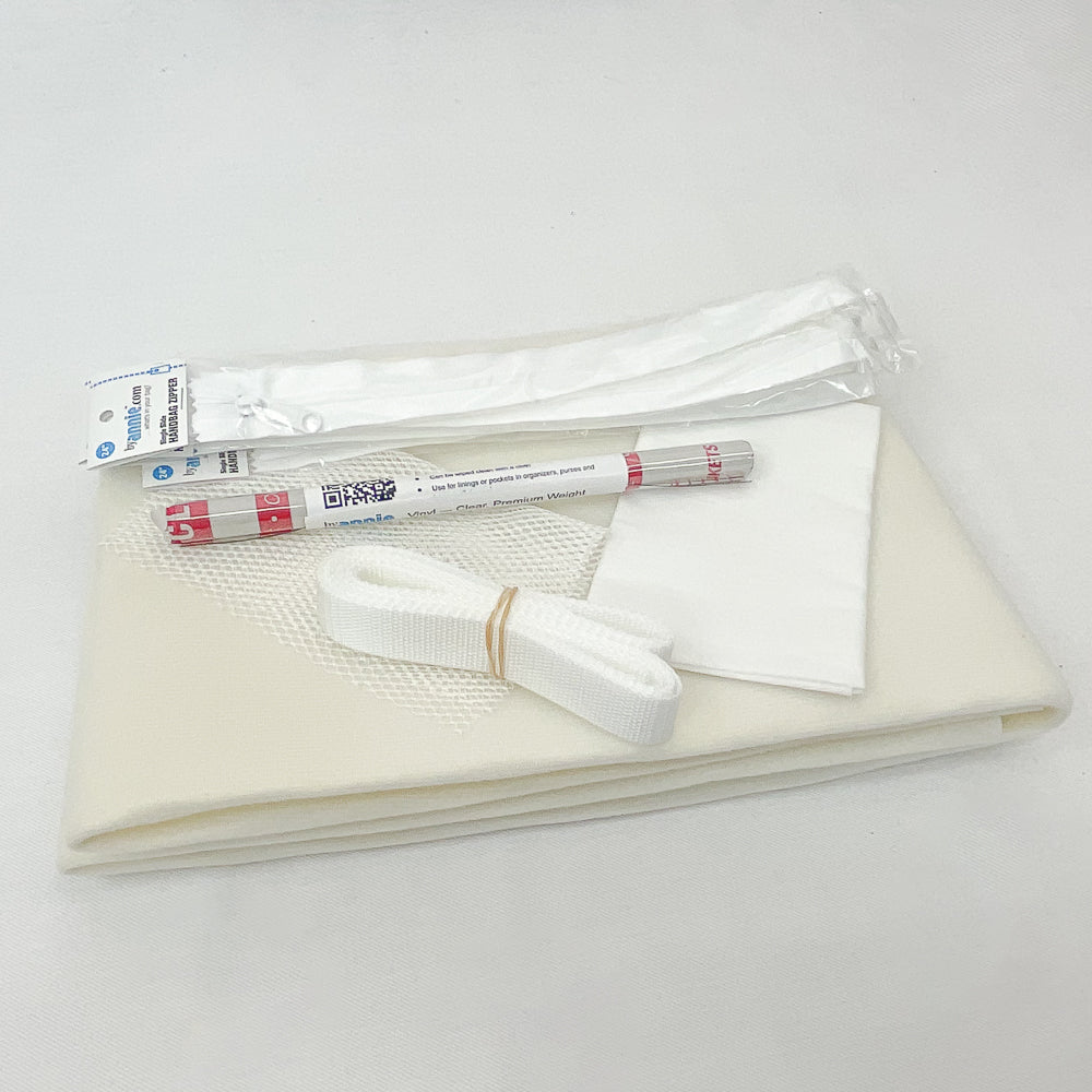 - 4, 24" white zippers, 1 pc premium weight vinyl, 1 pc mesh fabric, white webbing, 1 pc Shape Flex fusible interfacing, 1" nickel hardware set including d-rings and swivel hooks, 1 piece 14"x50" Foam fabric stabilizer
