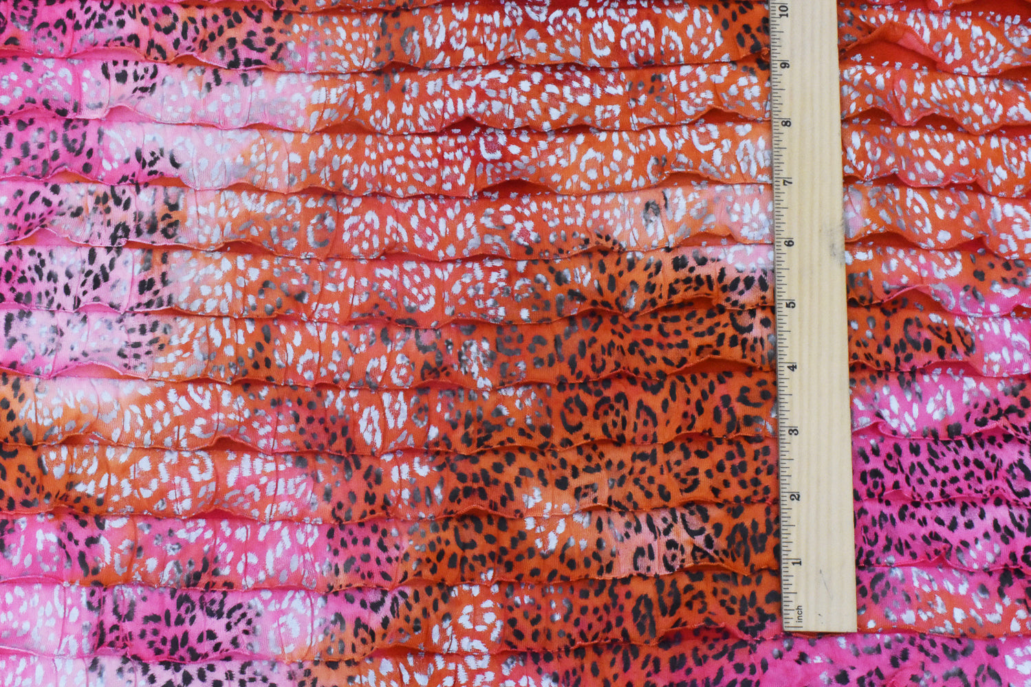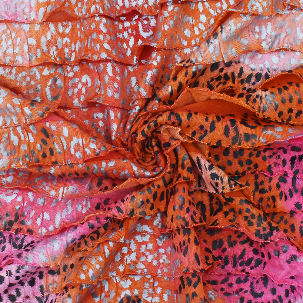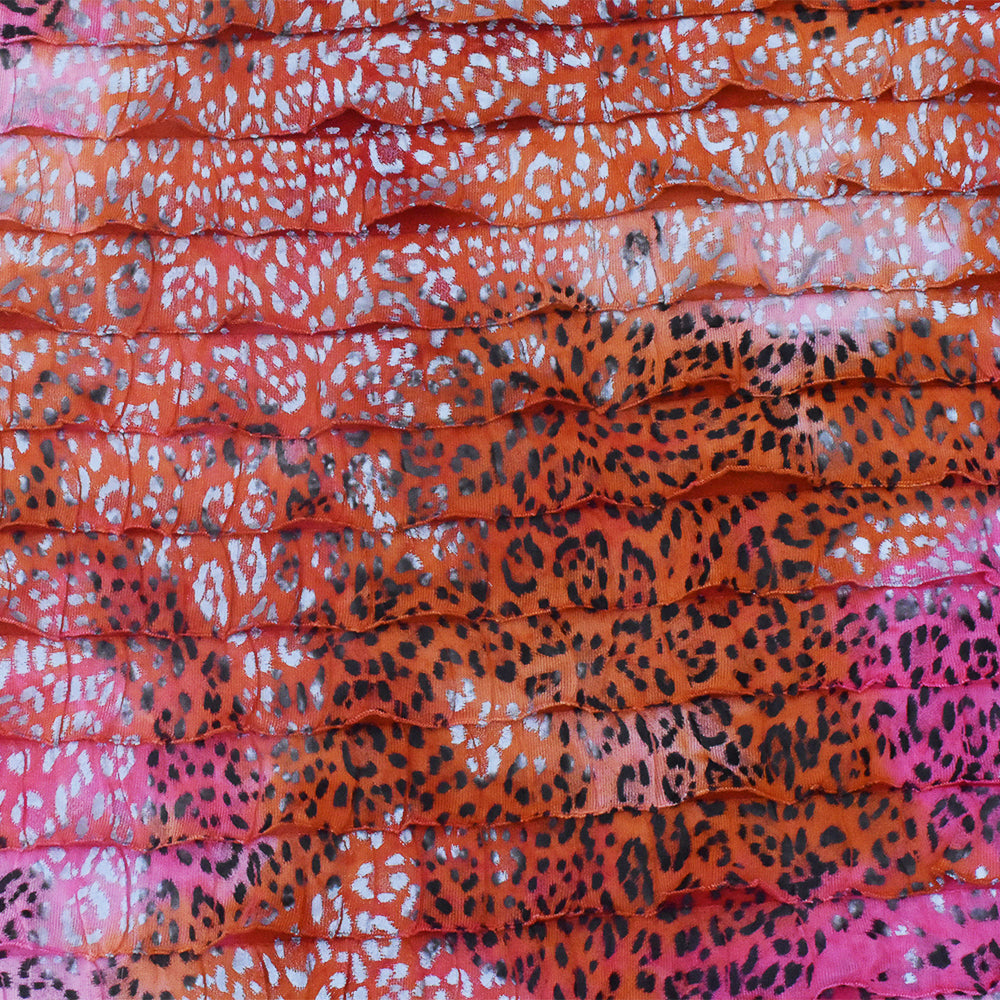 Orange-Pink-Multi Cheetah Printed Tie Dye Stretch Poly Ruffle Knit Fabric