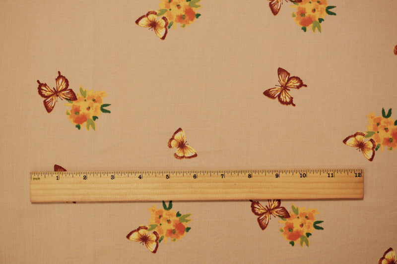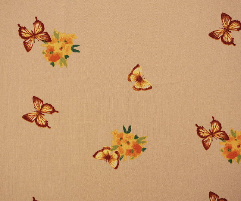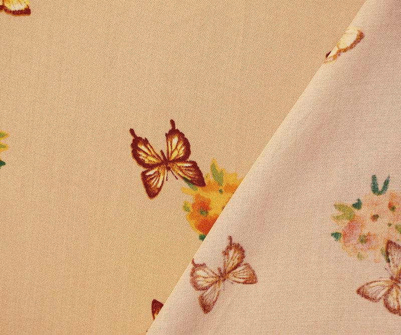 Beige-Orange-Multi Rayon Floral Butterfly Printed Challis Woven Fabric