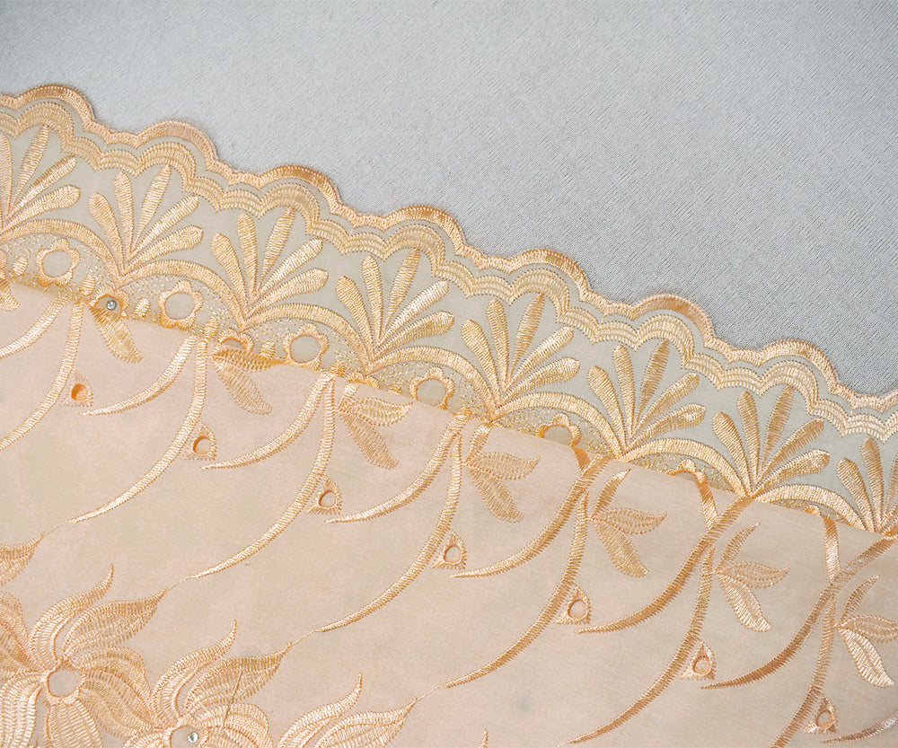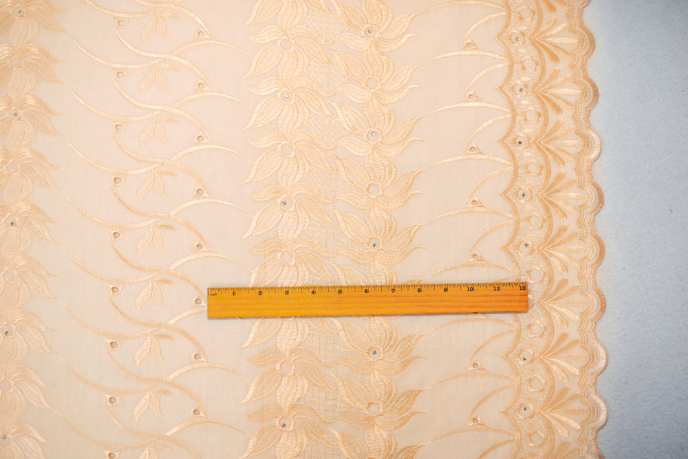 Light Beige Poly-Cotton Embroidered Floral Scallop Rhinestone Woven Fabric
