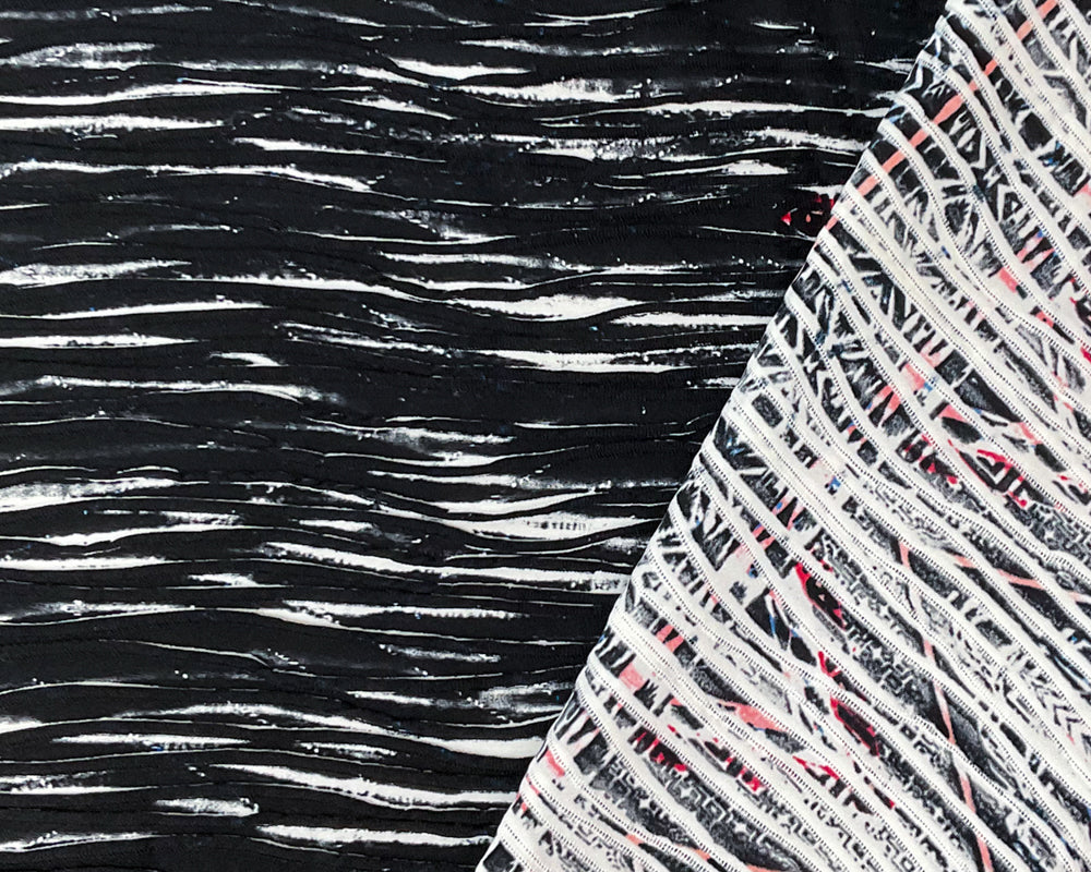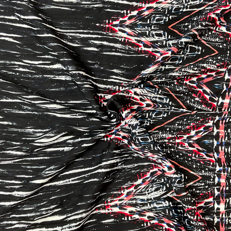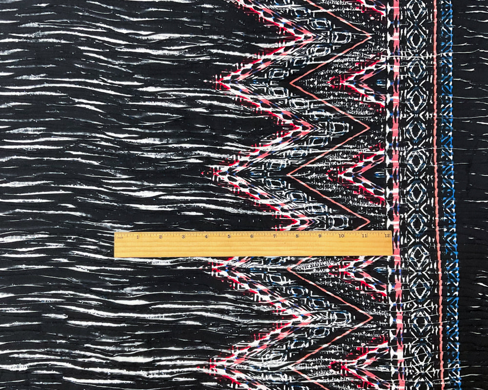-Black-Blue-Multi Poly Chevron Border Printed Pleat Knit Fabric - A sleek chevron border in deep black and blue adds a modern graphic touch to the edges of this versatile pleated knit.