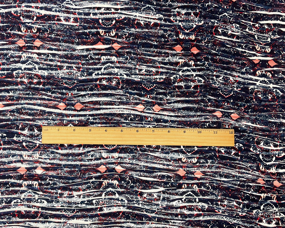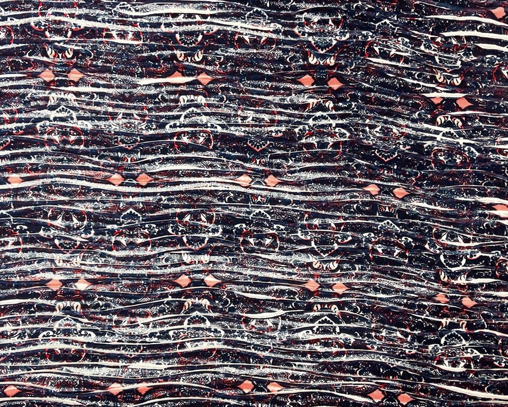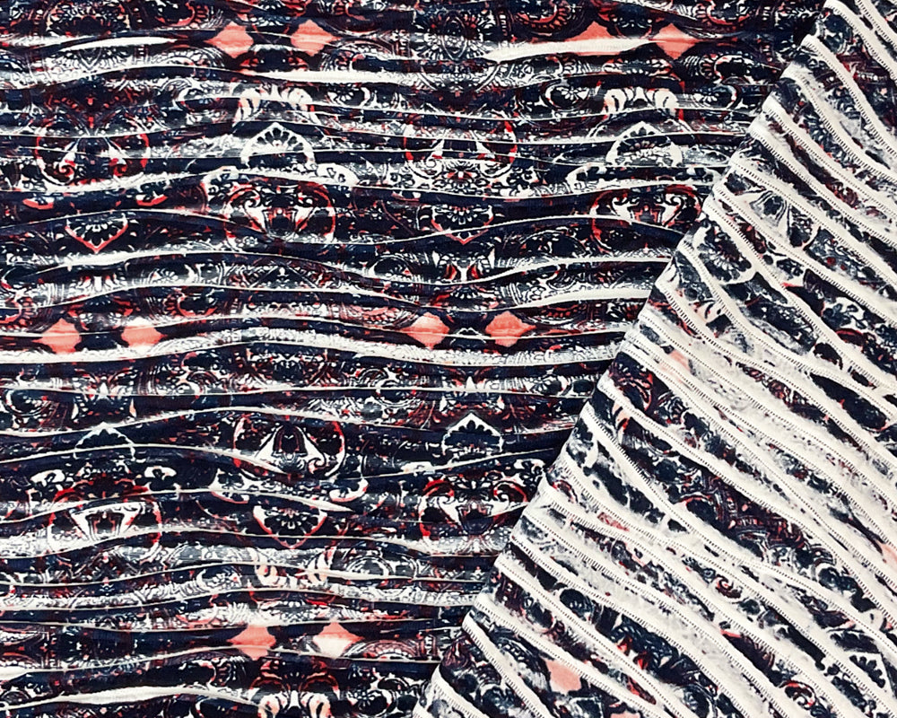 -Deep blue, red, and multi baroque motifs bring a regal yet playful energy, enhanced by the pleated knit's smooth drape.