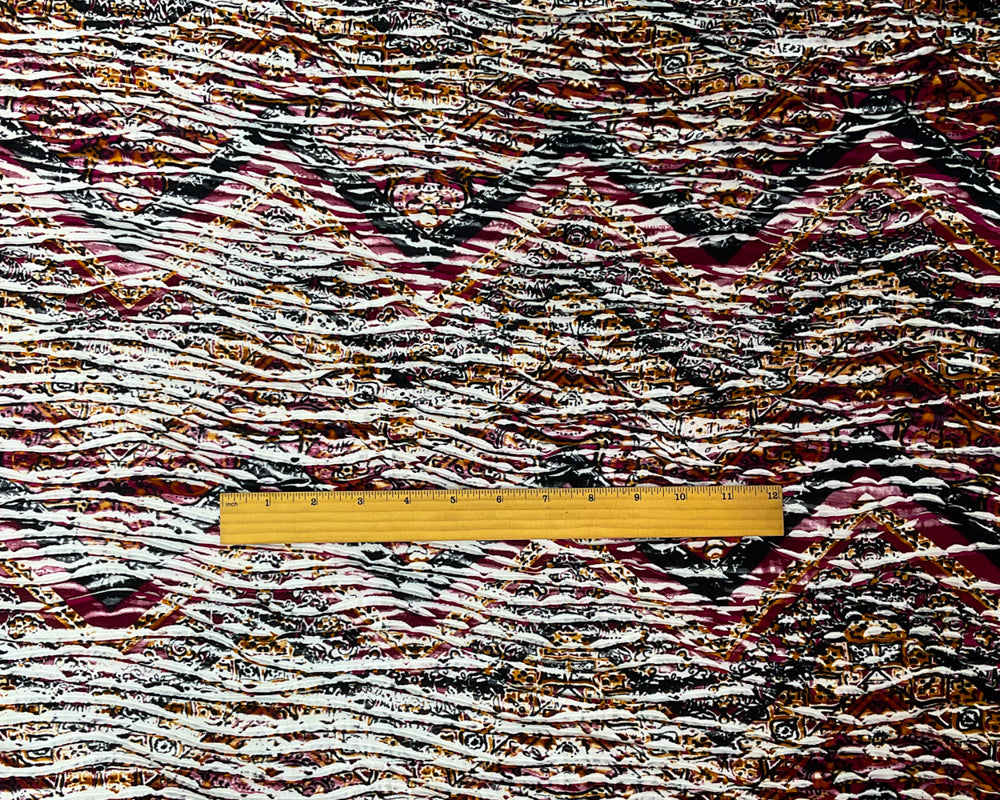 -Red-Brown-Multi Poly Chevron Baroque Printed Pleat Knit Fabric - Zigzag chevron stripes intertwine with ornate baroque elements in warm red and brown tones, producing a bold, textured visual effect.
