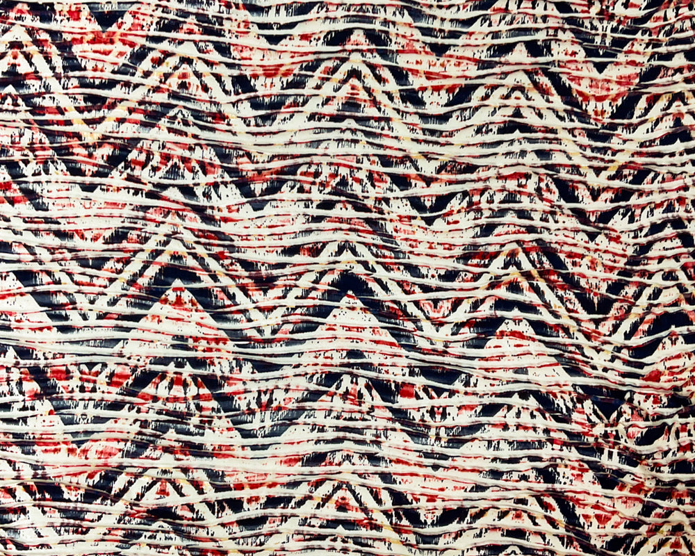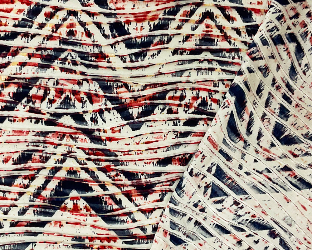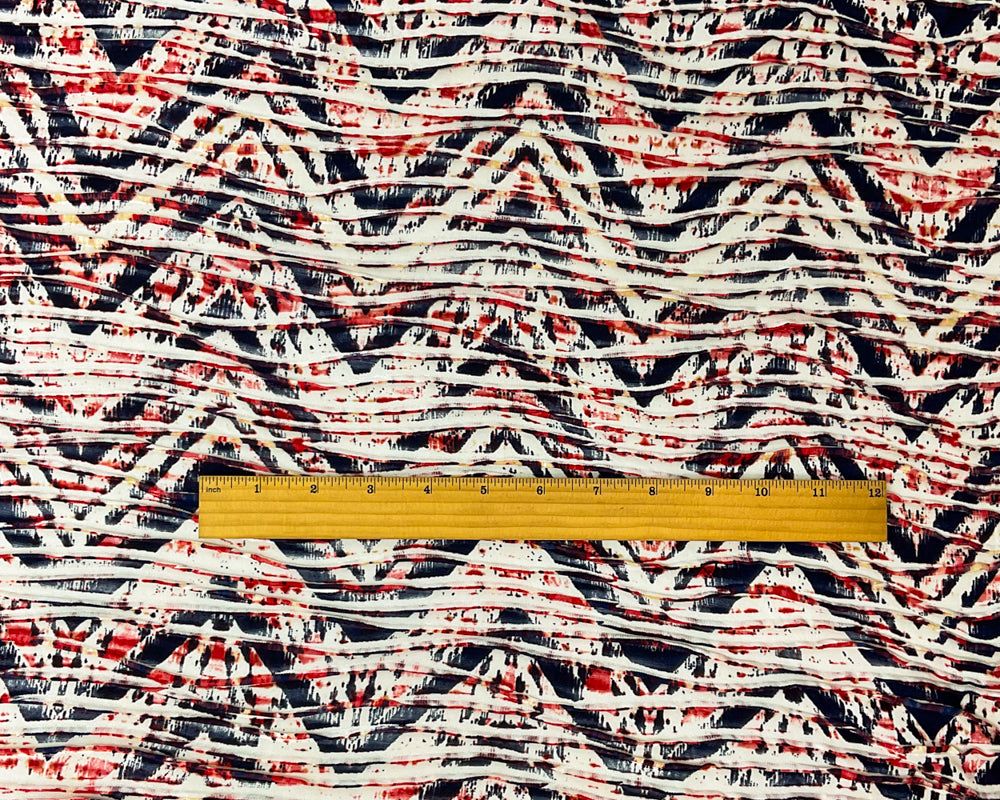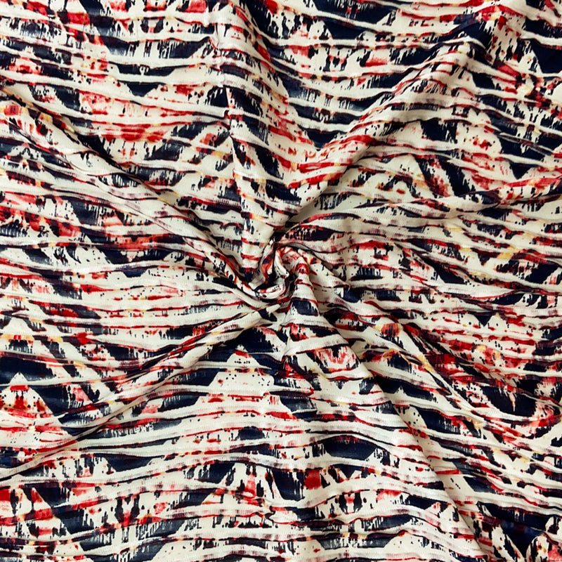 -Red-White-Multi Poly Chevron Printed Pleat Knit Fabric - A playful mix of tie-dye inspired pattern and sharp chevron stripes in vibrant red and white gives this fabric a lively, energetic personality.