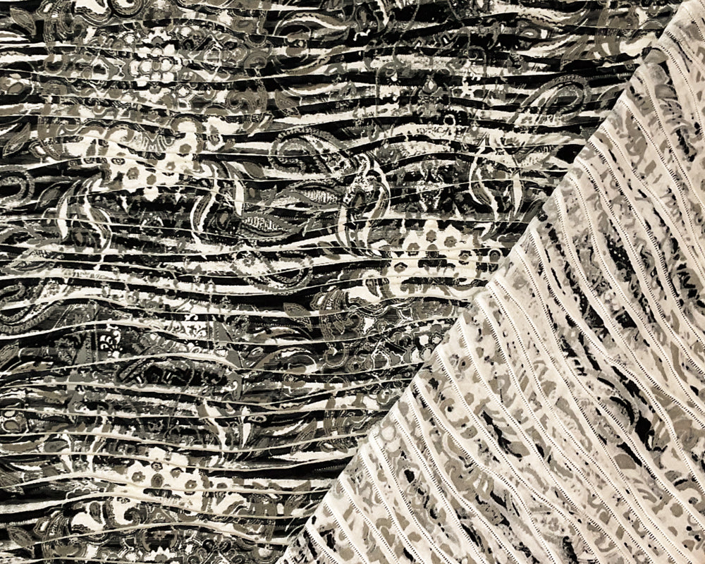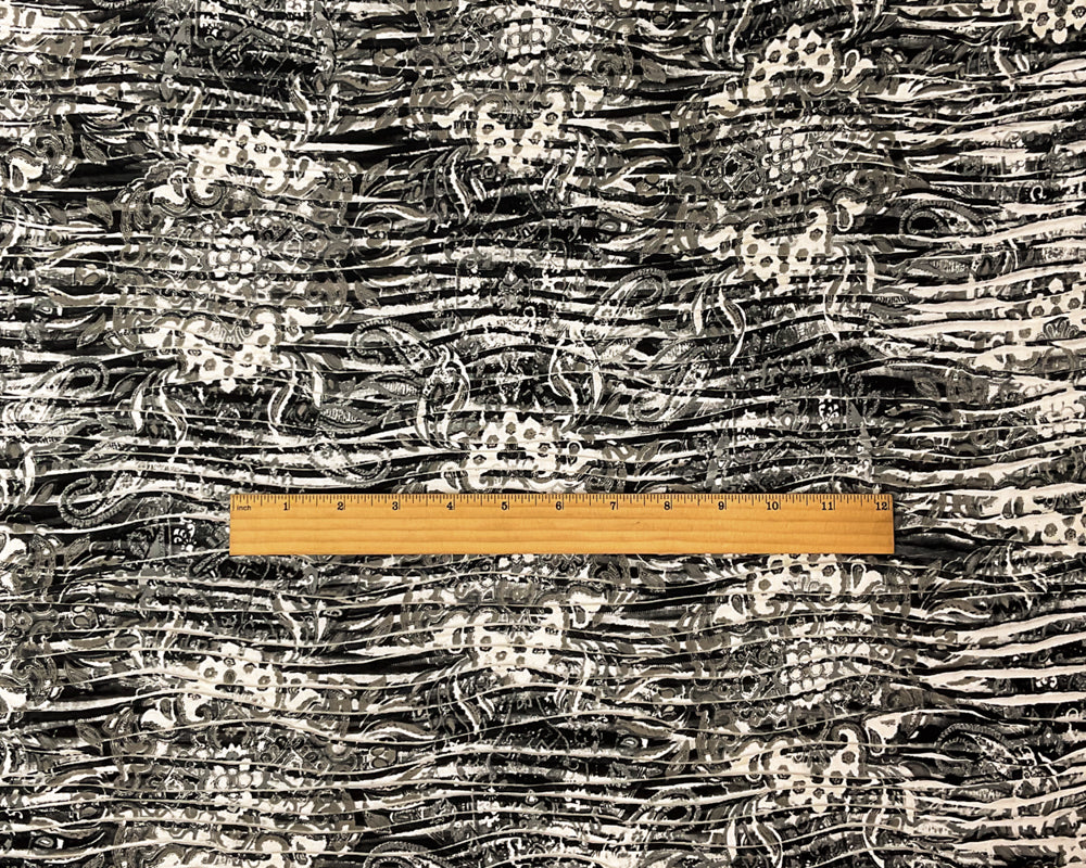 -White-Black-Beige Poly Baroque Printed Pleat Knit Fabric - Intricate baroque patterns cover the entire surface, offering a luxurious, vintage-inspired design on a smooth, flowy pleated knit.