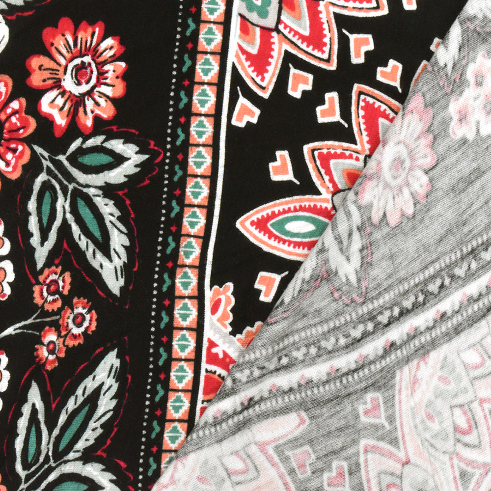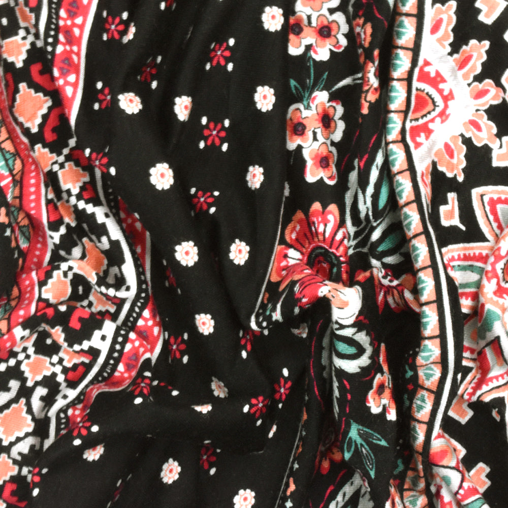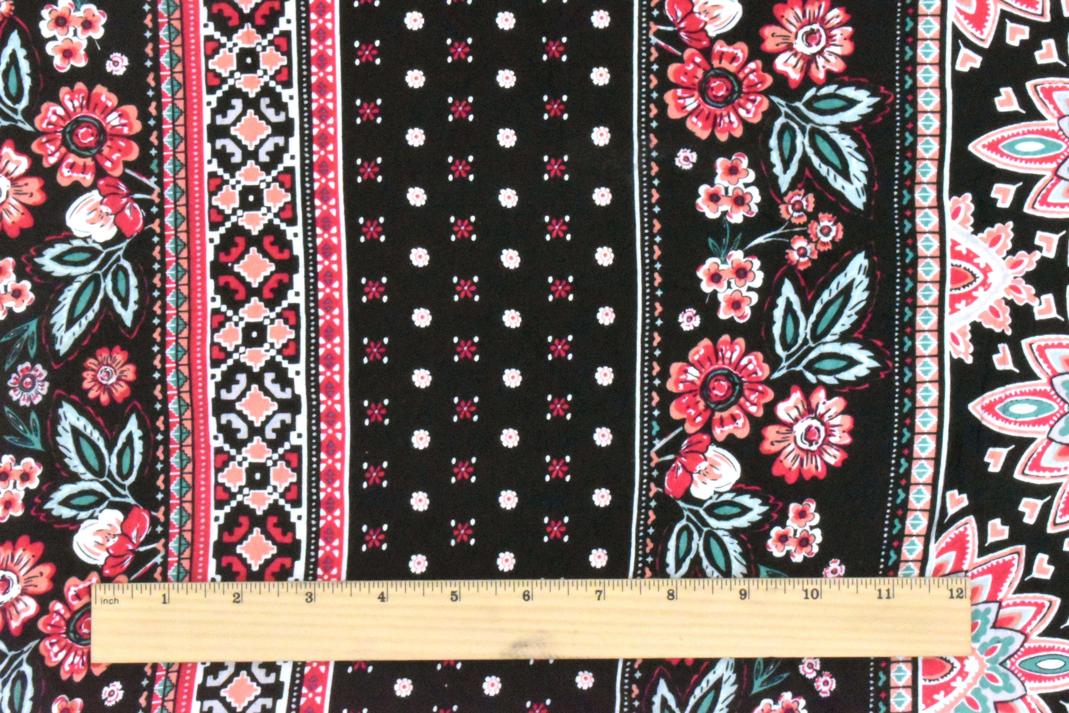 Black-Coral-Multi Mix Stripe Floral Print Rayon Stretch Jersey Knit Fabric