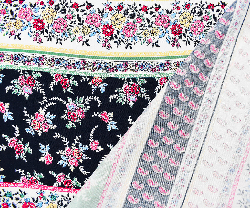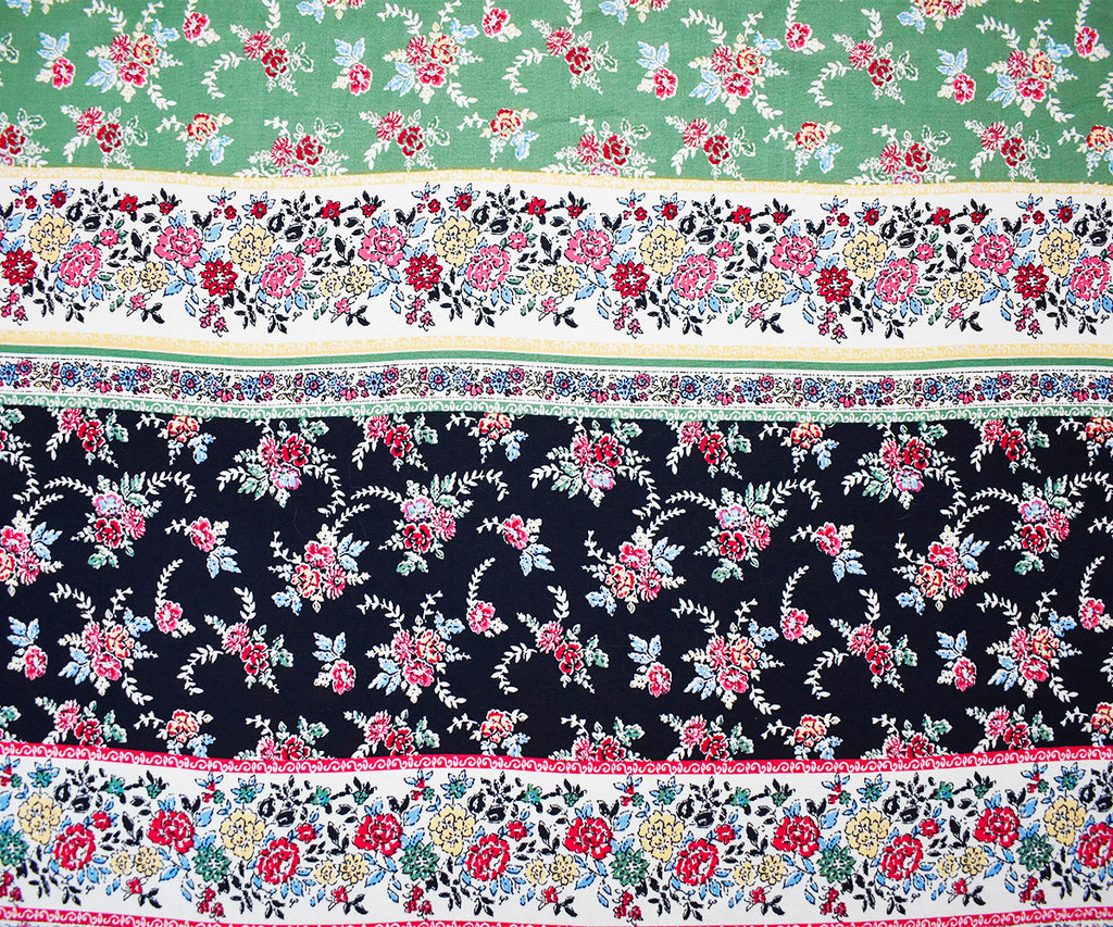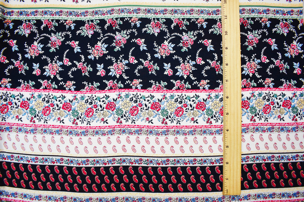 -100% rayon challis fabric printed with a striped pattern with florals and paisley motifs