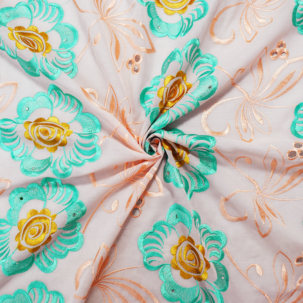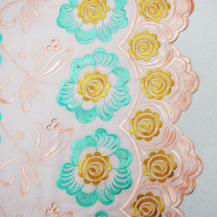 Coral Orange-Multi Poly Embroidered Floral Scallop Rhinestone Woven Fabric