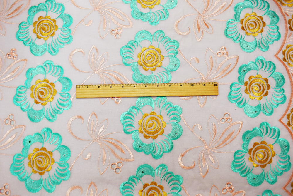 -100% Polyester sheer plain woven fabric embroidered with an African inspired pattern featuring large-scale florals, eyelets, scrolls, scalloped edges, and decorated with hints of rhinestones.