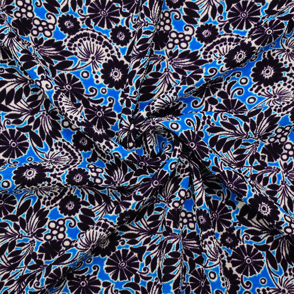 Deep Purple-Aqua-White Poly Floral Printed Pebble Crepe Woven Fabric