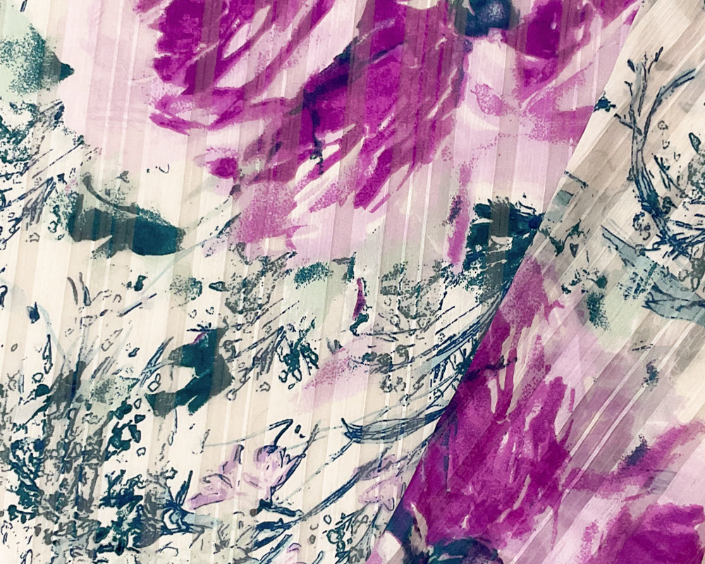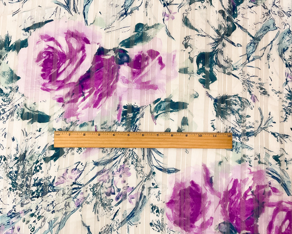 Purple-Multi Poly Floral Print Satin Stripe Chiffon Woven Fabric