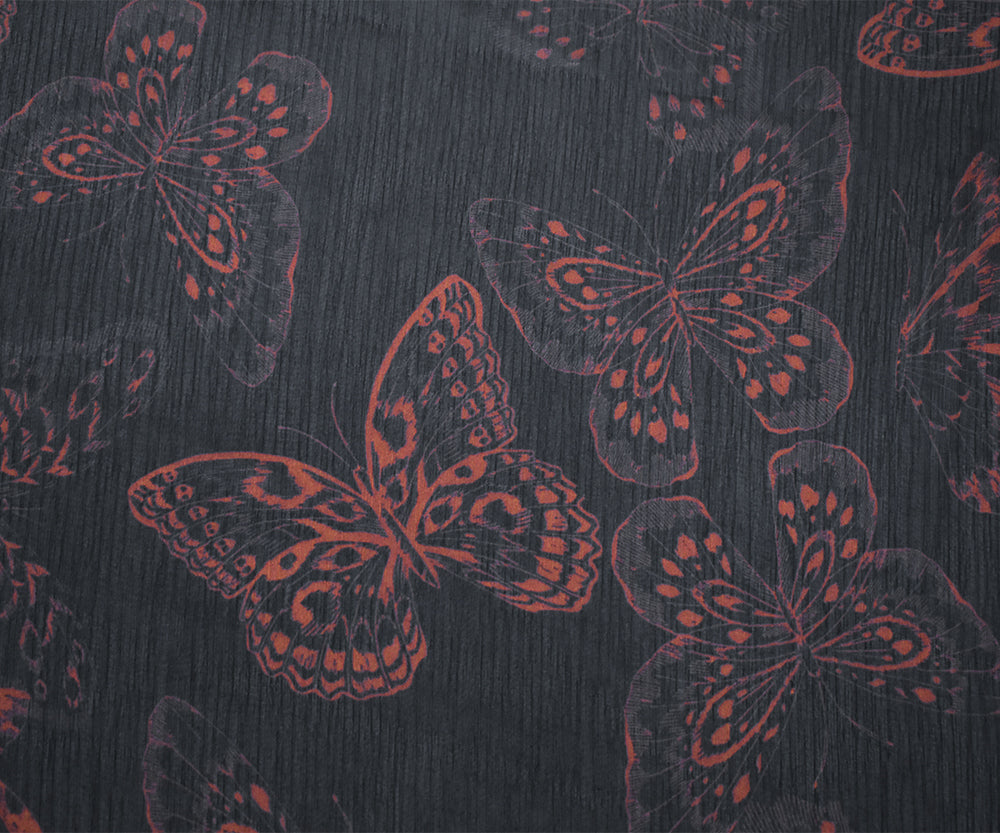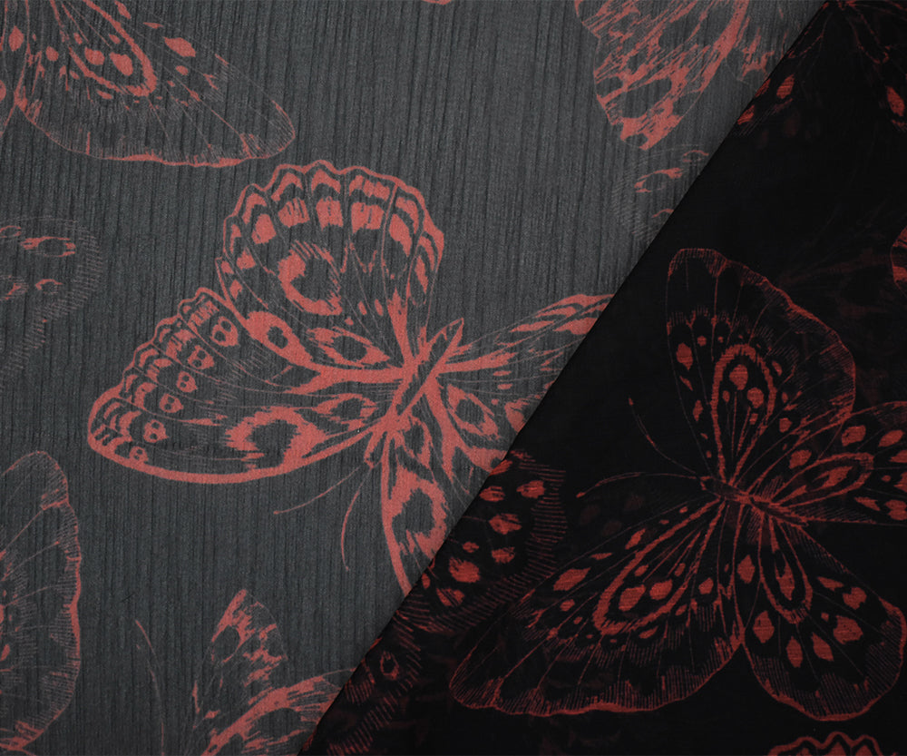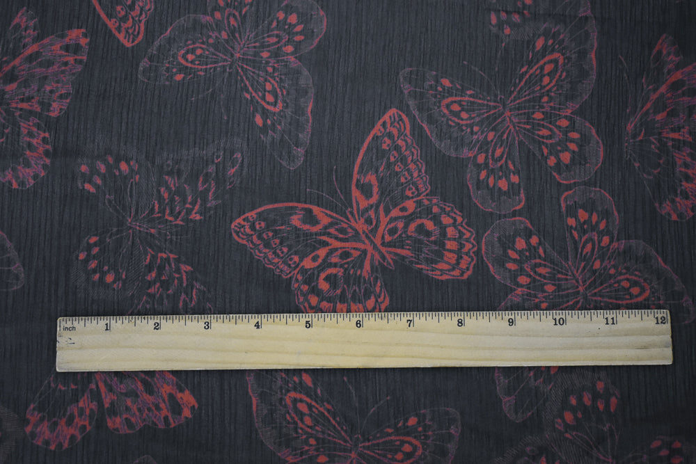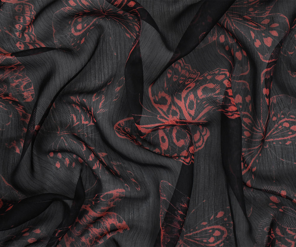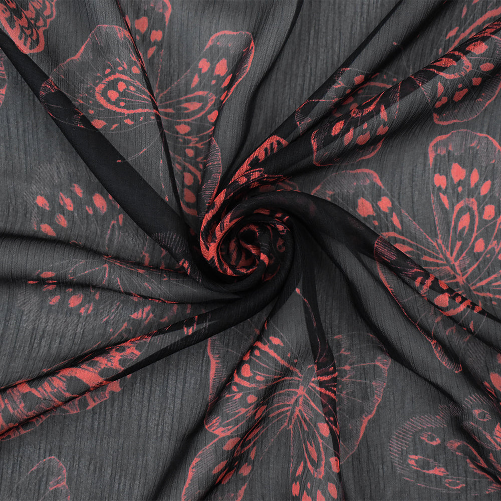 Black-Red Butterfly Printed Yoryu Chiffon Woven Fabric