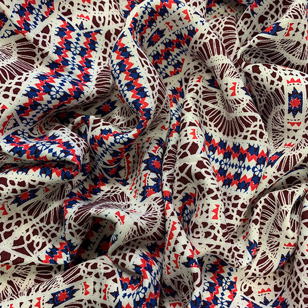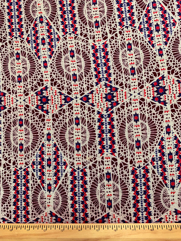 Blue and Red Lace Look Print Rayon Challis Fabric
