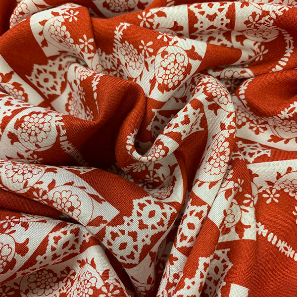 Red and White Lace Look Print Rayon Challis Fabric