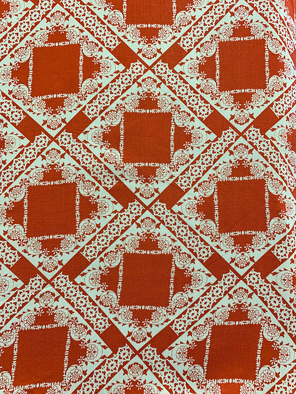 -Red and White Lace Look Print Rayon Challis Fabric