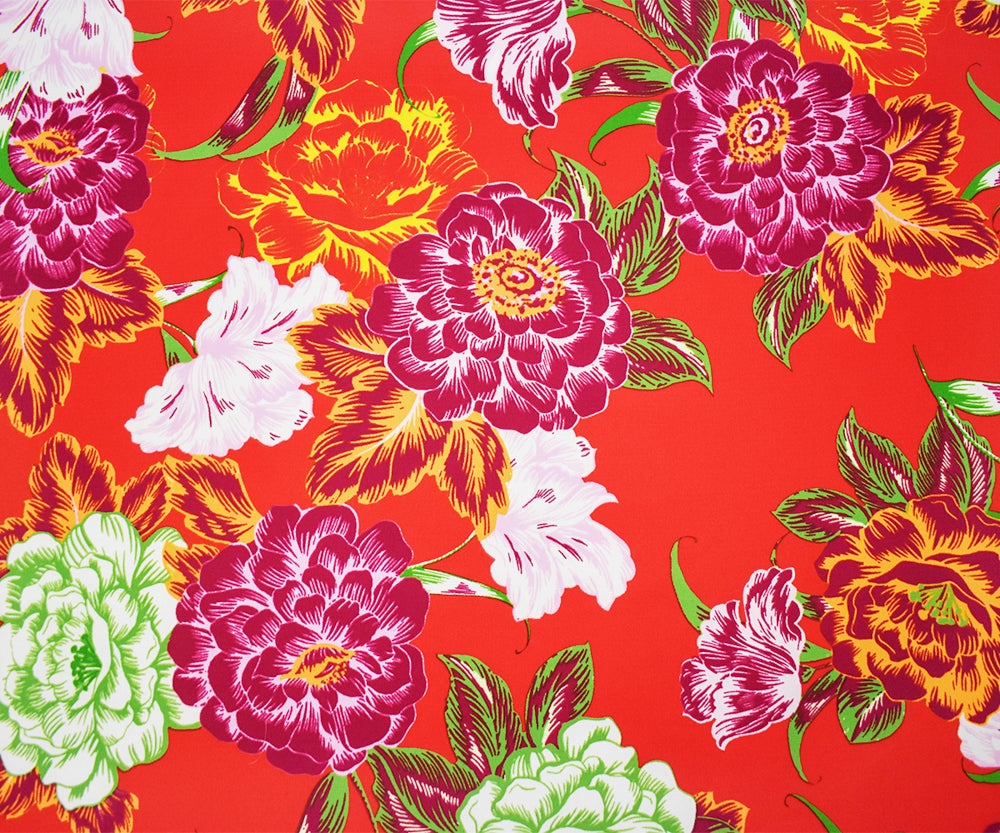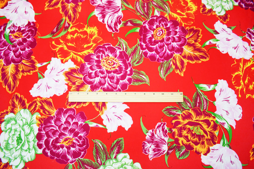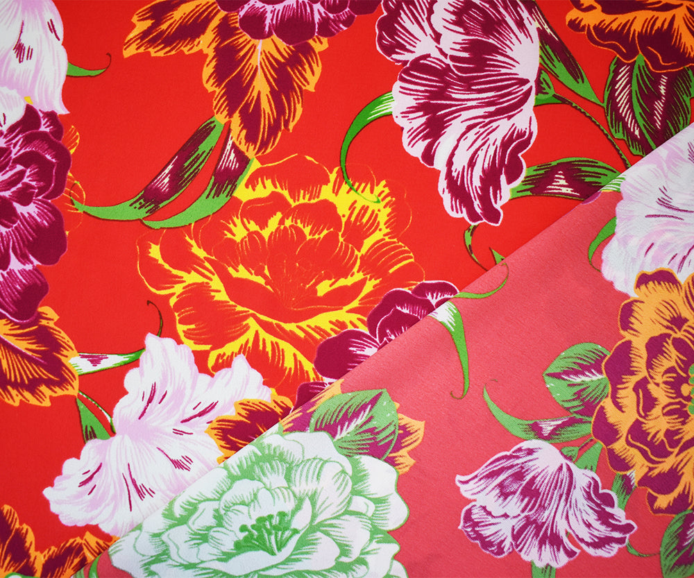 Red-Purple-Multi Poly Floral Print Pebble Crepe Woven Fabric