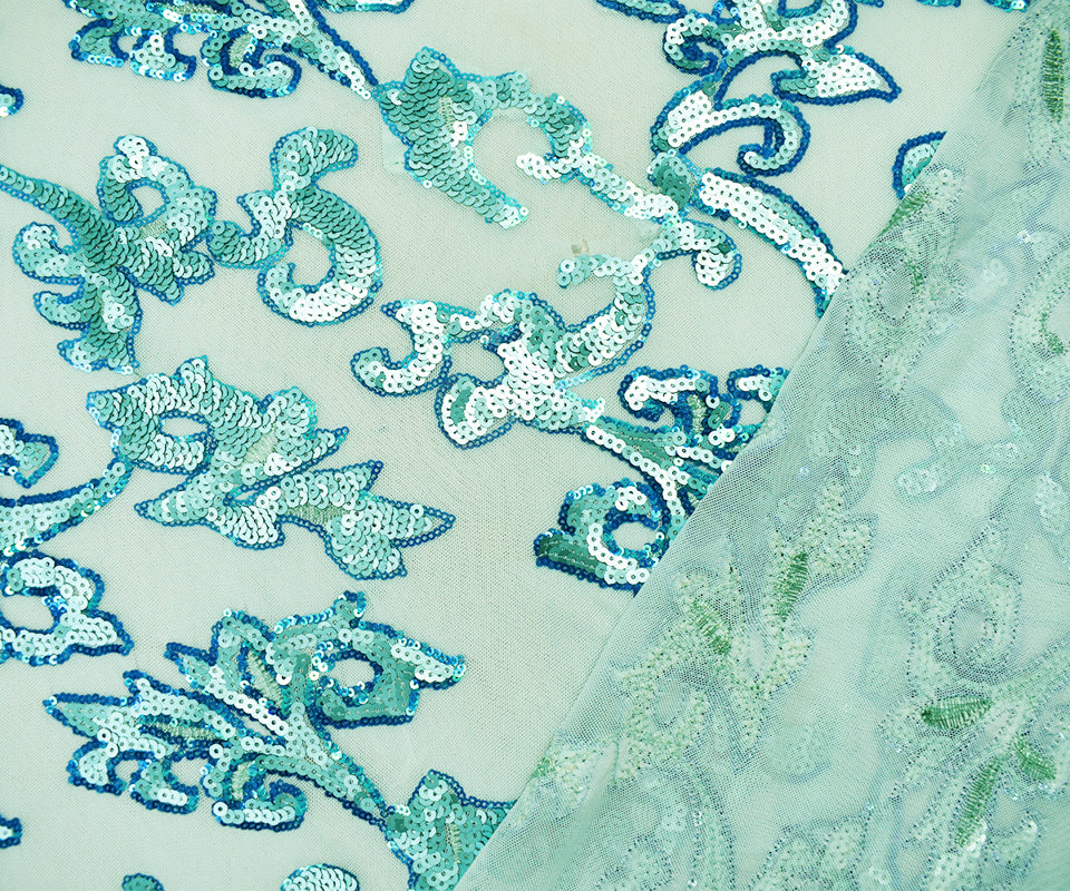 Teal-Blue Nylon Baroque Vine Sequined Stretch Spandex Tulle Mesh Fabric
