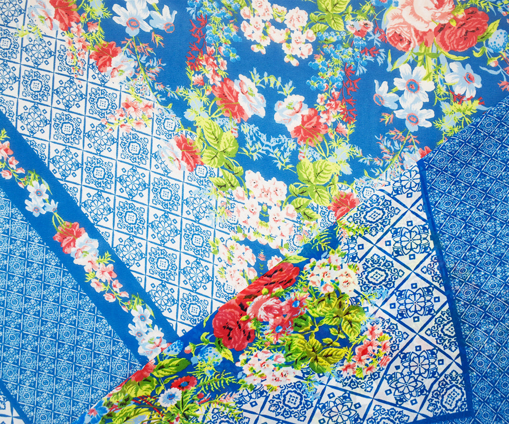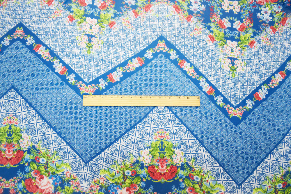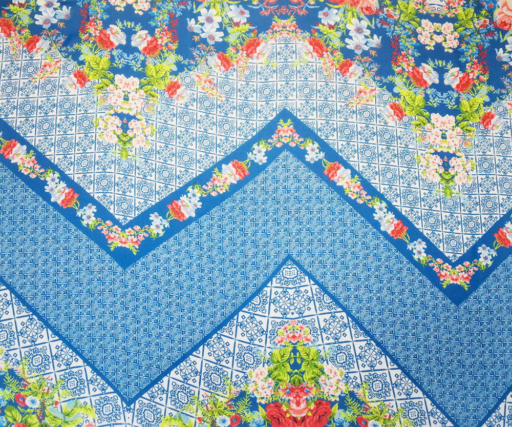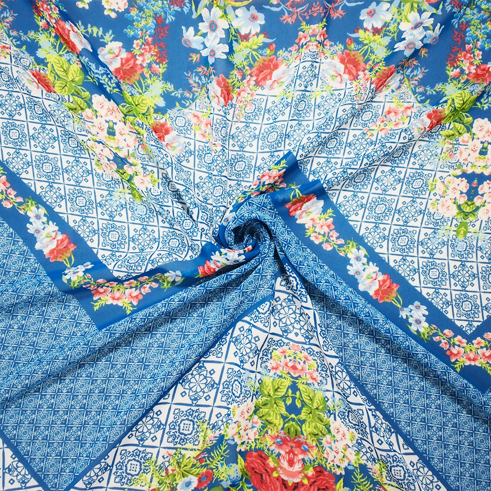 Teal Blue-Orange Multi Poly Floral Border Printed Chiffon Woven Fabric