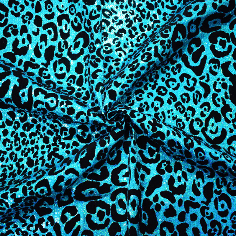 -Polyester fully sequined stretch spandex knit fabric with a velvet flocked leopard print