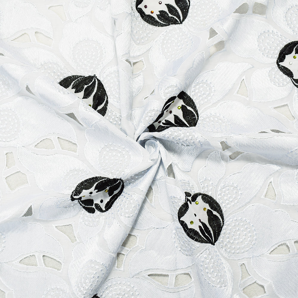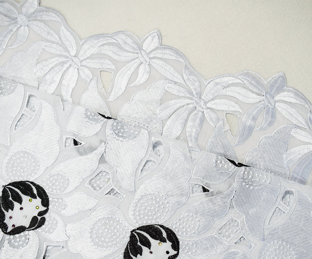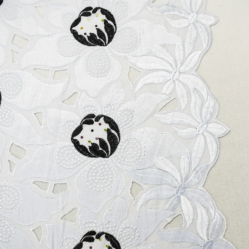 -100% Polyester plain woven fabric embroidered with African inspired design with florals, cut-out designs, hints of multi colored rhinestones, and scalloped selvedges.