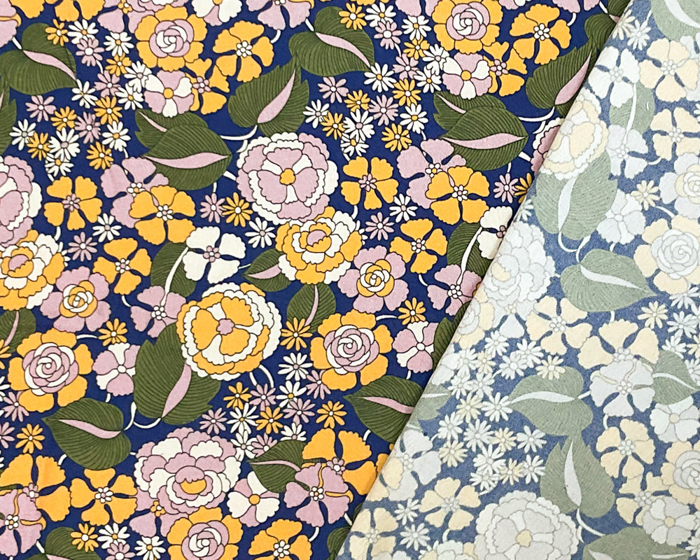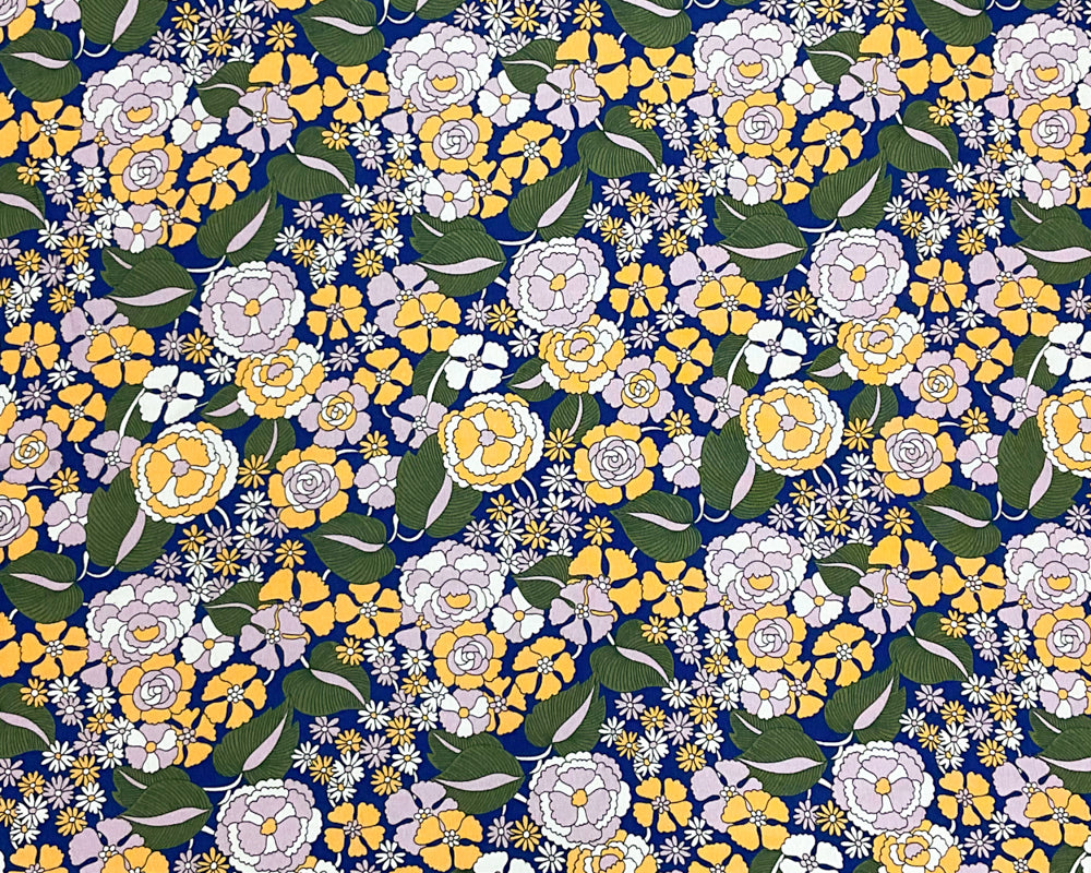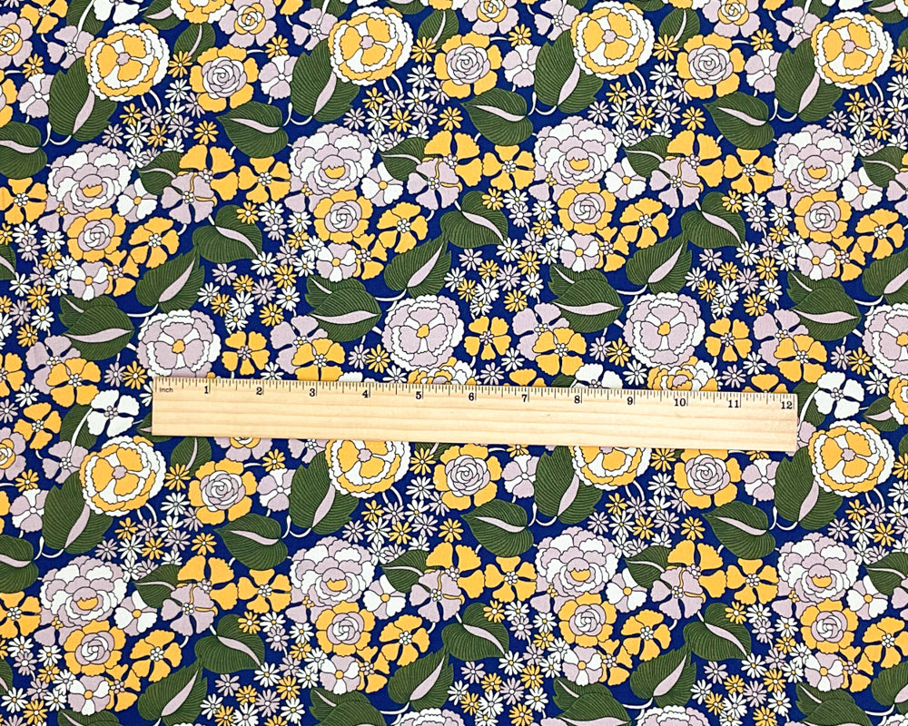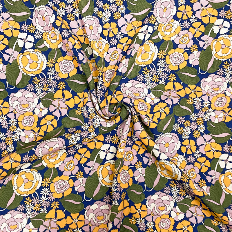 Blue-Yellow-Multi Rayon Floral Printed Crepe Faille Woven Fabric