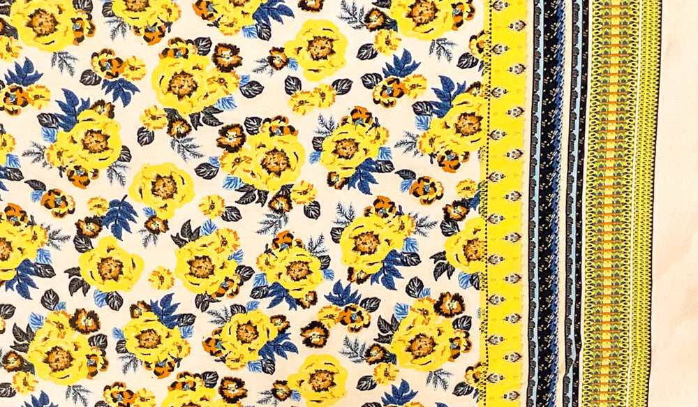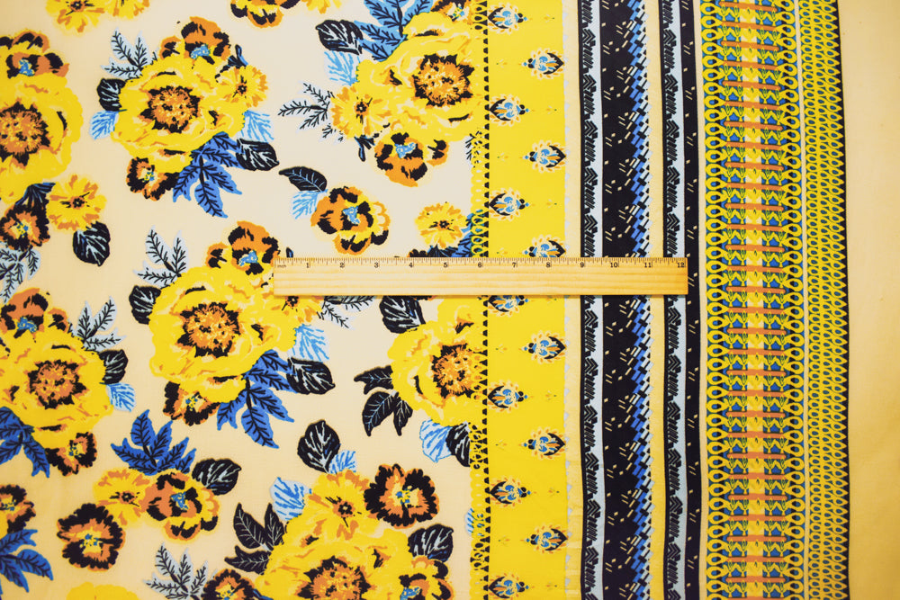 Yellow-Blue-Multi Poly Floral Printed Pebble Crepe Woven Fabric