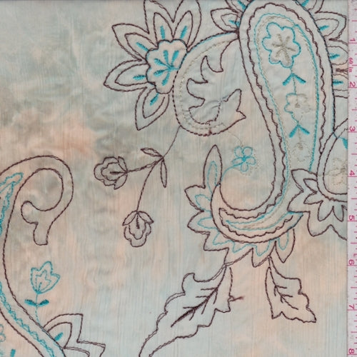 Beige/Spa Blue Embroidered Paisley Crinkled Chiffon Fabric