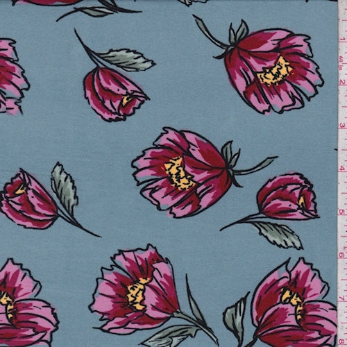 Dusty Blue/Ruby Fringe Floral Double Brushed Jersey Knit Fabric