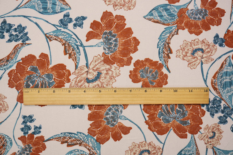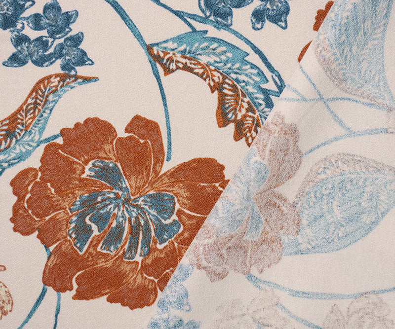 Ivory-Brown-Teal Rayon Floral Printed Momie Crepe Woven Fabric