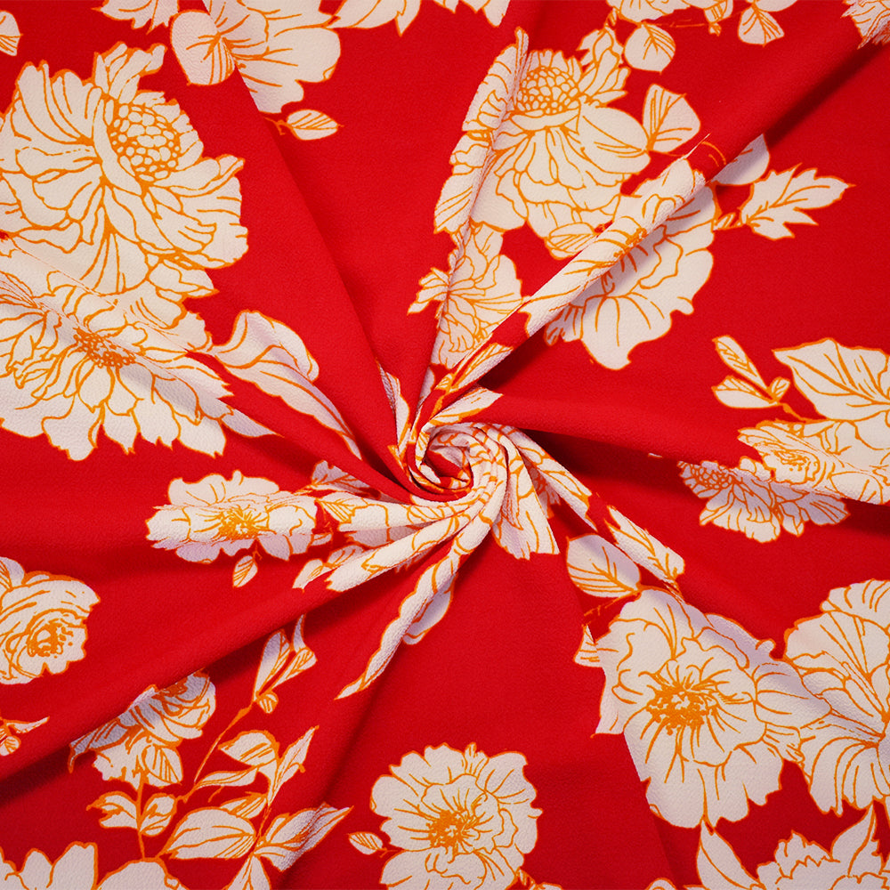 Red-Orange-White Poly Floral Printed Pebble Crepe Woven Fabric