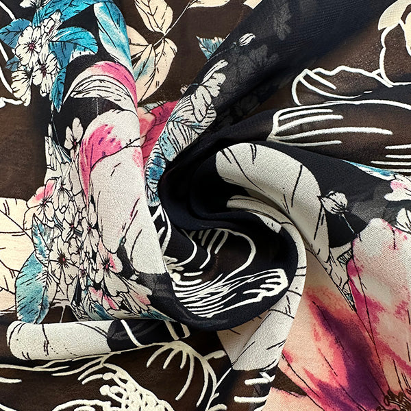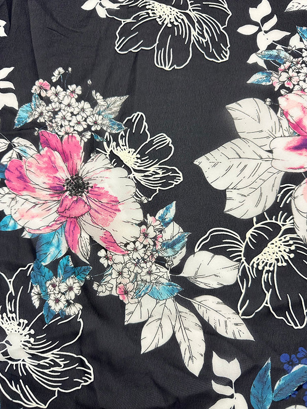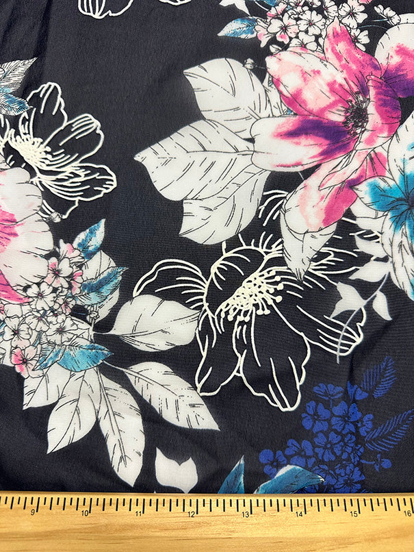 Blue and Pink Flocked Floral Poly Chiffon Fabric