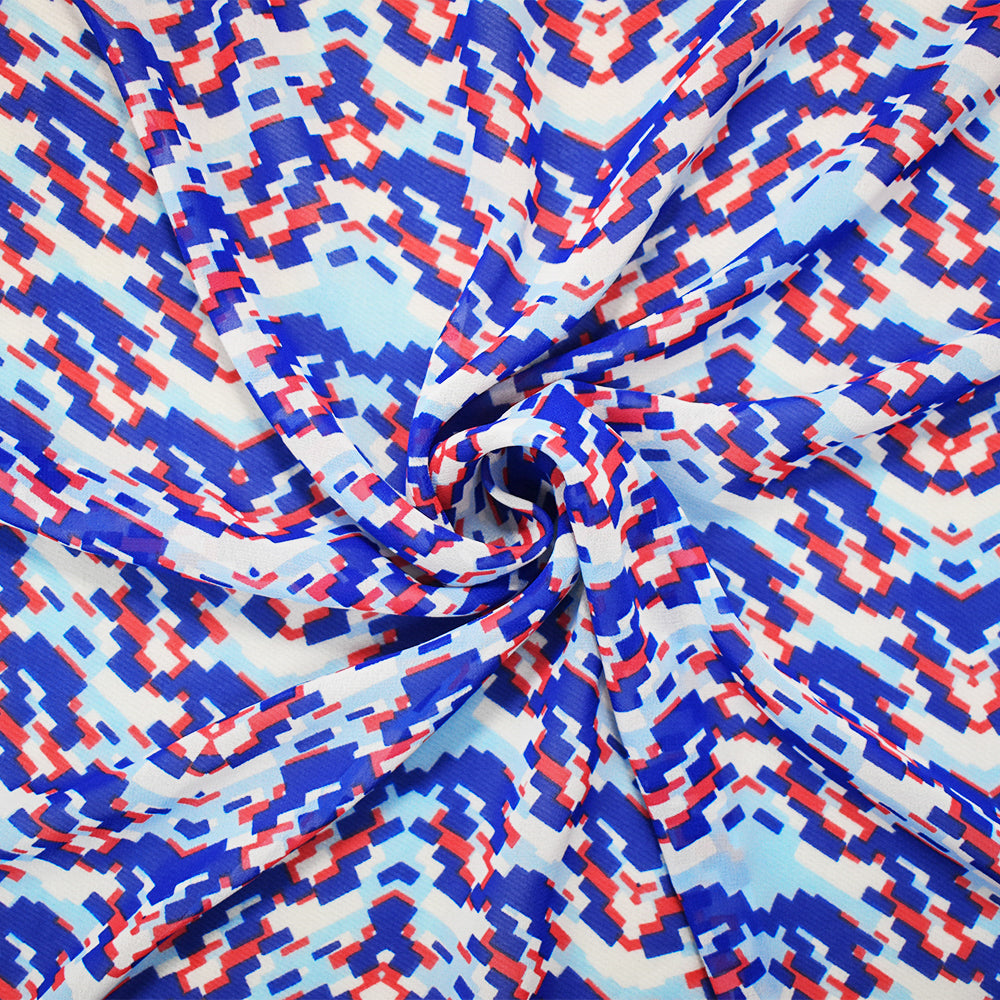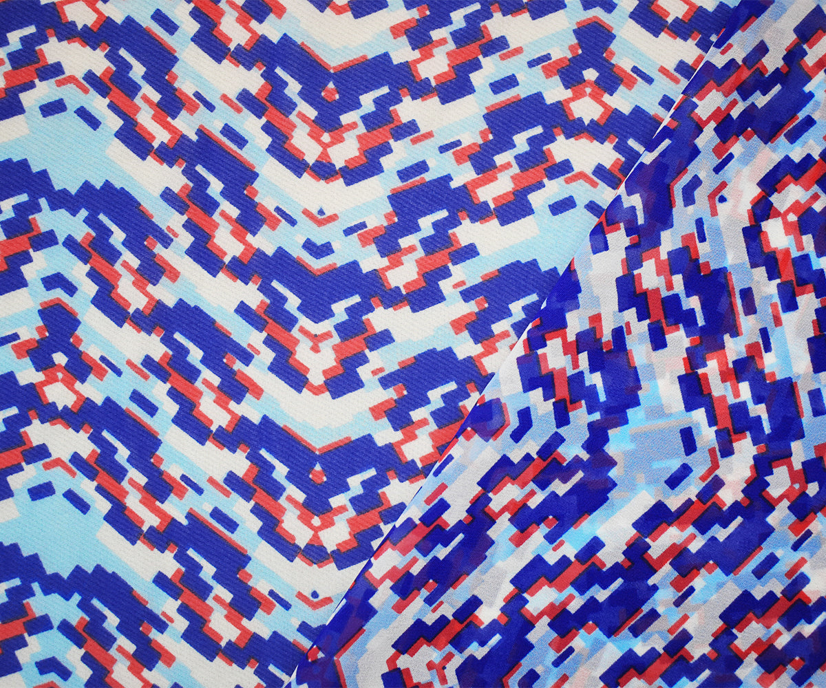 Blue-Red-White Poly Pixel Chevron Printed Chiffon Woven Fabric