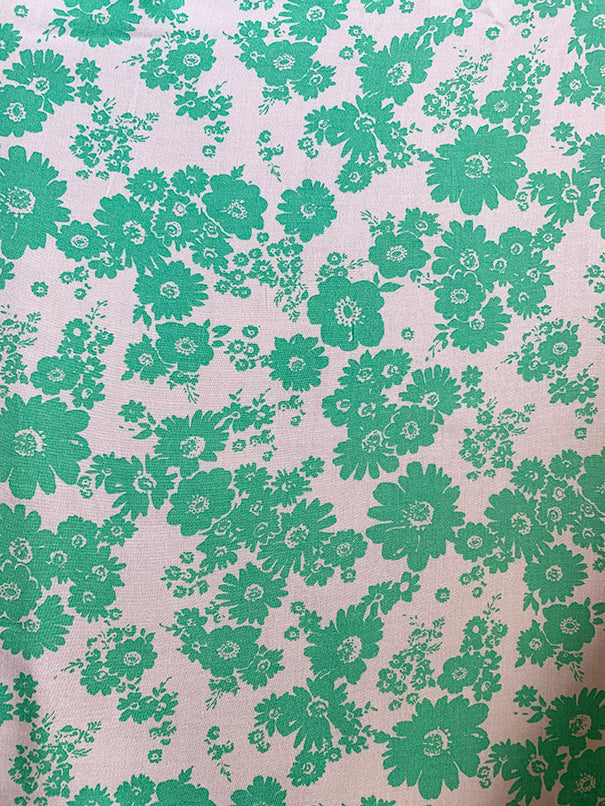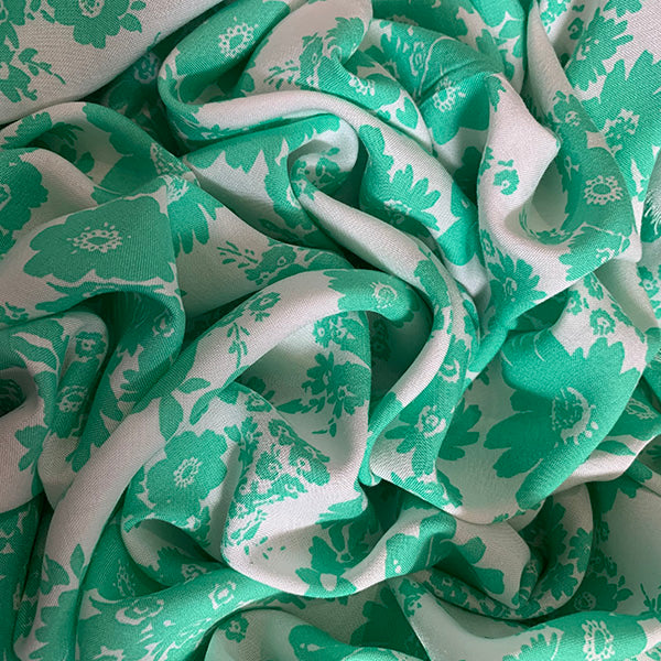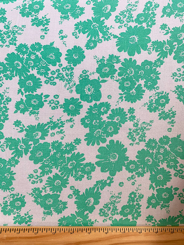 -Aqua Green Daisy Floral Print on White Rayon Challis Fabric
