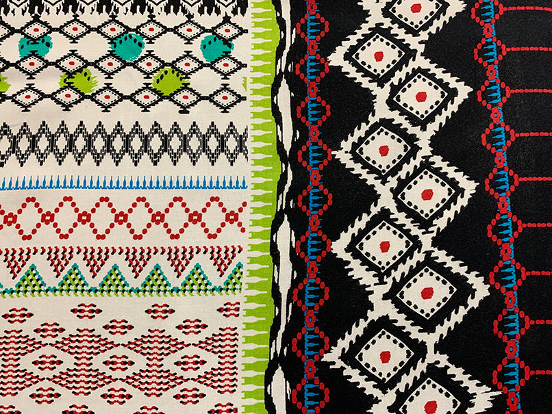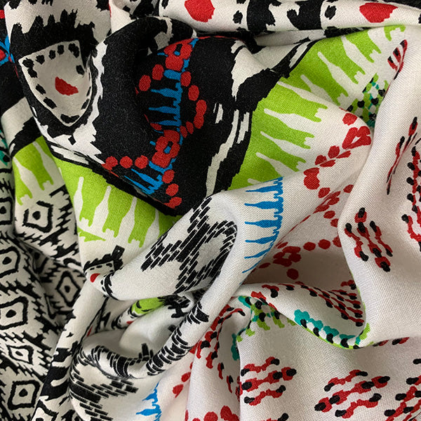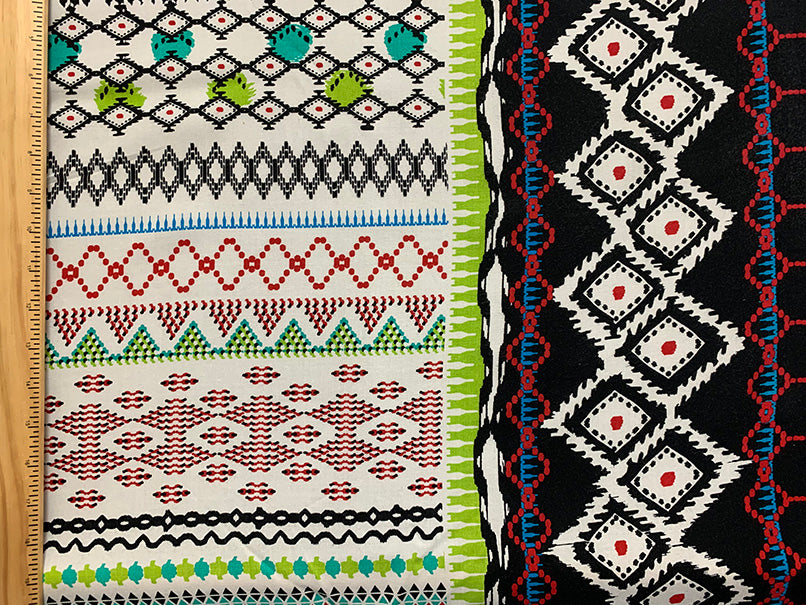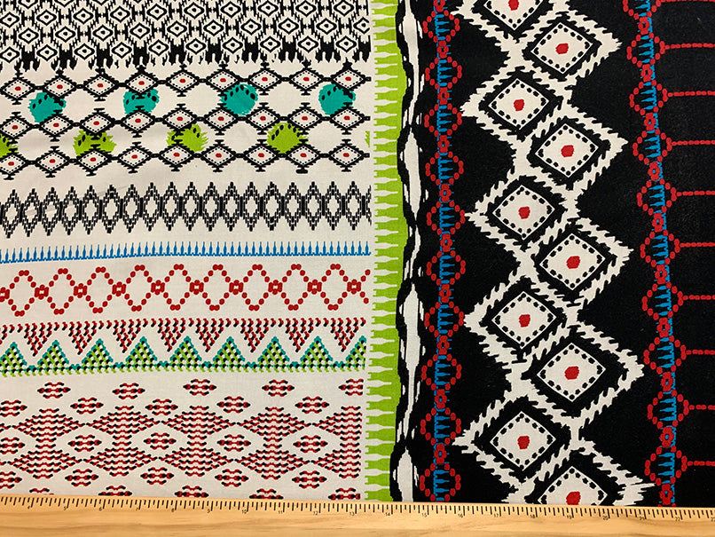 -Black, White, Lime, Red, & Turquoise Abstract Stripe Print Rayon Challis Fabric w/ 11 1/4" border on each selvedge