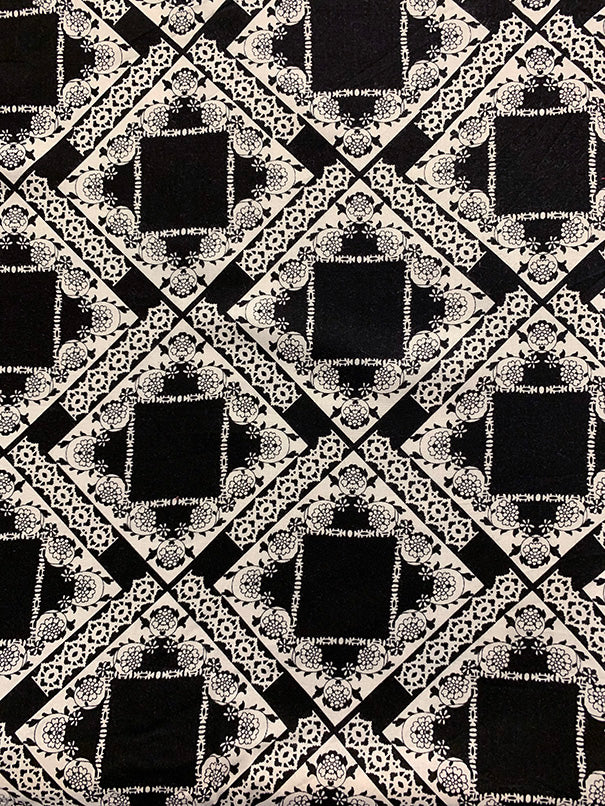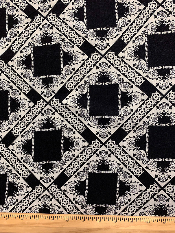 -Black and White Lace Look Print Rayon Challis Fabric