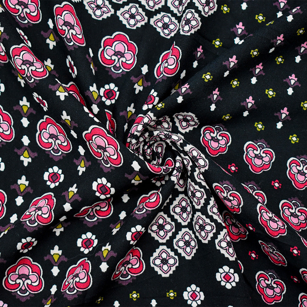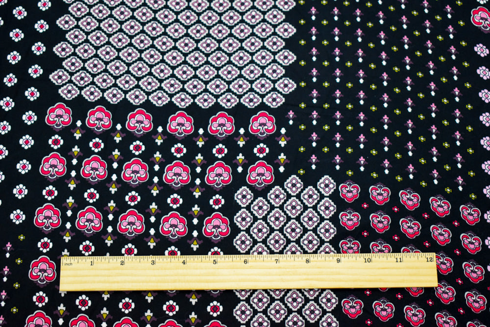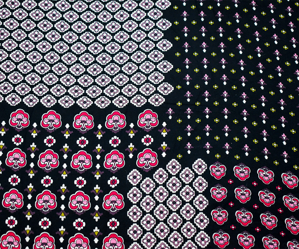Black-Red-Multi Rayon Floral Patch Printed Challis Woven Fabric