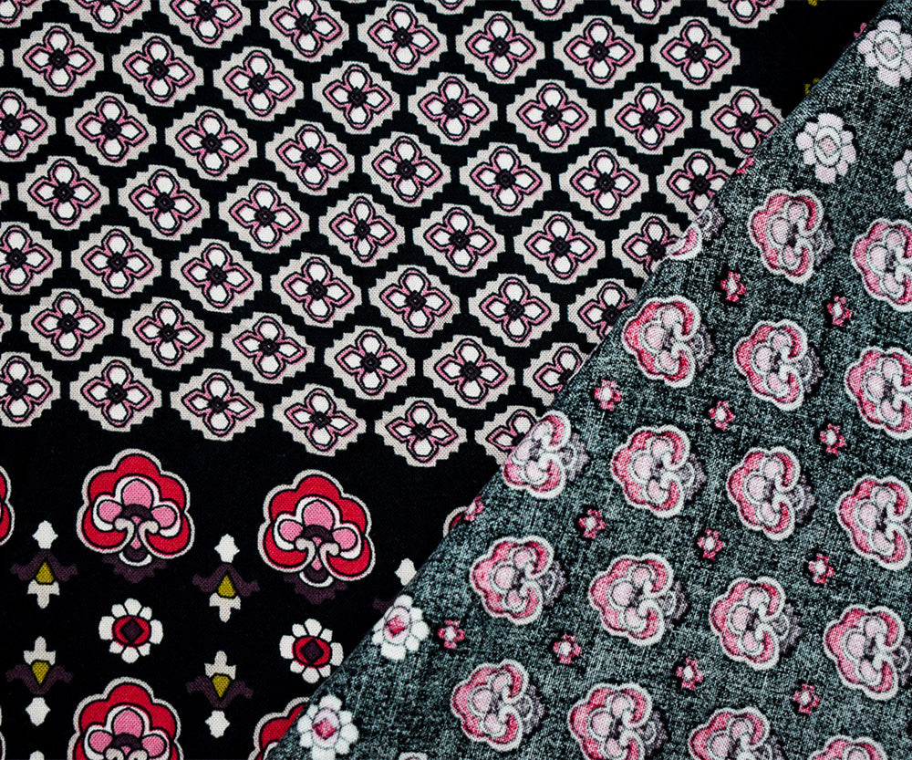 -100% rayon challis woven fabric printed with floral inspired motifs in a patch-like stylized pattern