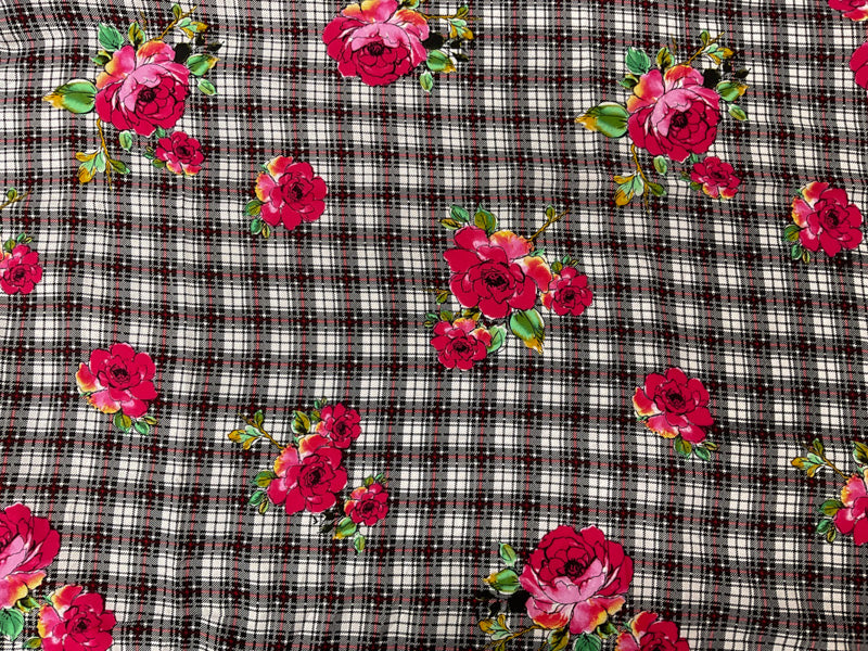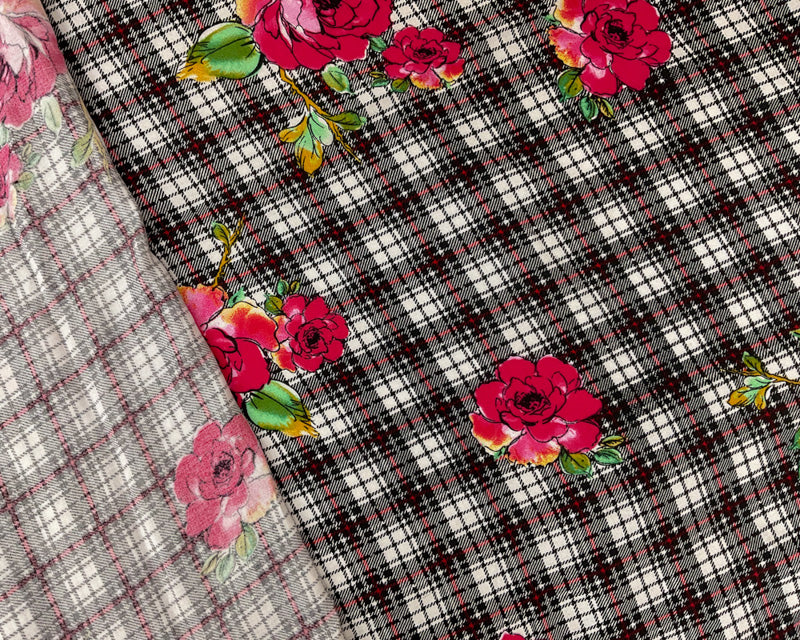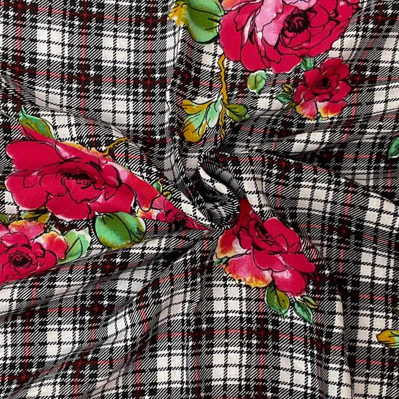 -This rayon fabric features a unique printed design combining floral and plaid motifs on a lightweight challis weave. The soft, fluid drape of the construction makes it ideal for blouses, scarves, and flowing dresses.