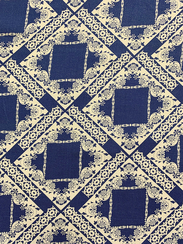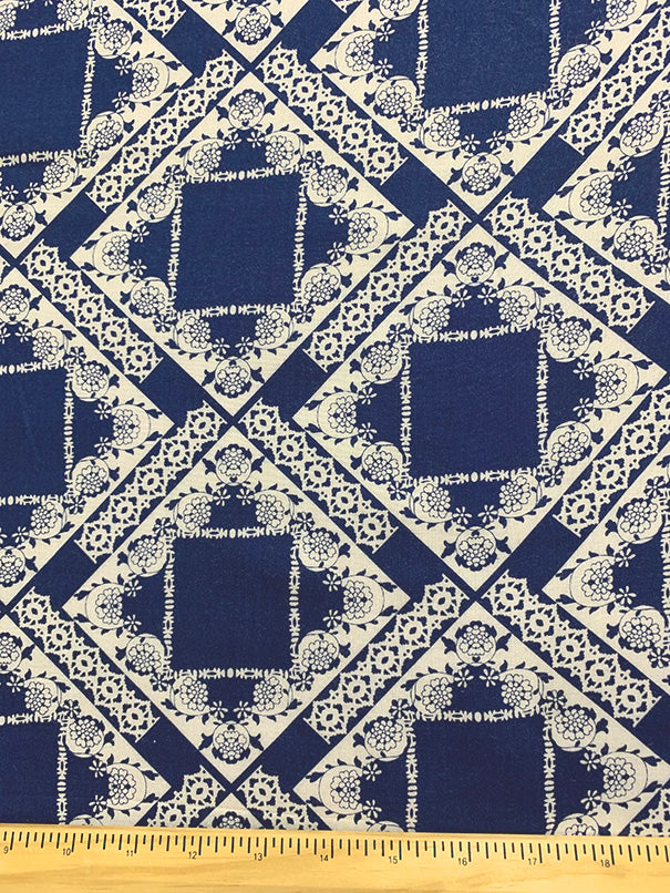-Blue and White Lace Look Print Rayon Challis Fabric