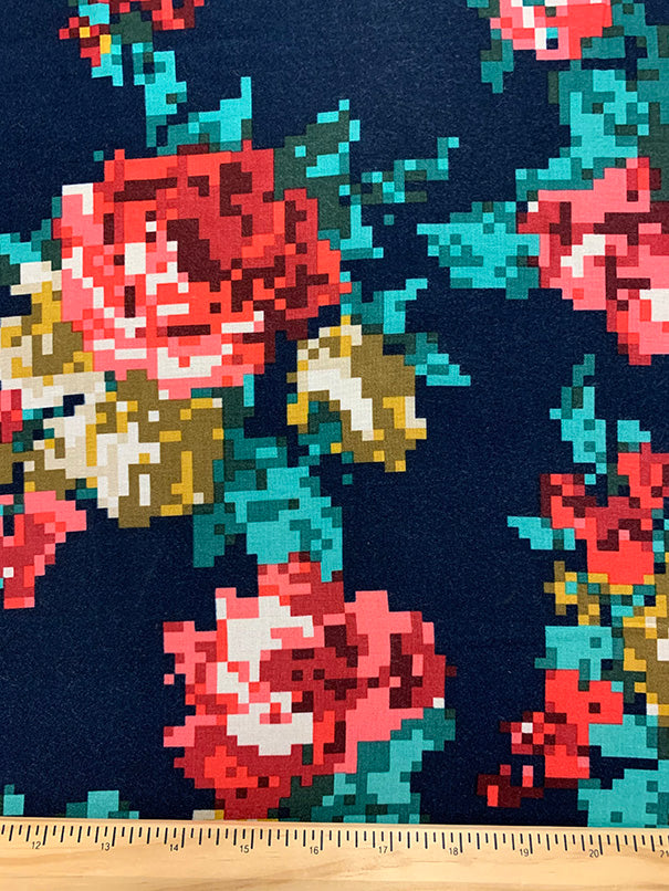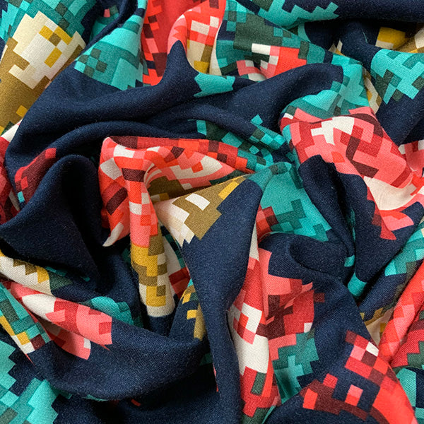 -Red, Coral, Green, Ivory, Beige, & Gold Pixelized Floral Print on Blue Rayon Challis Fabric